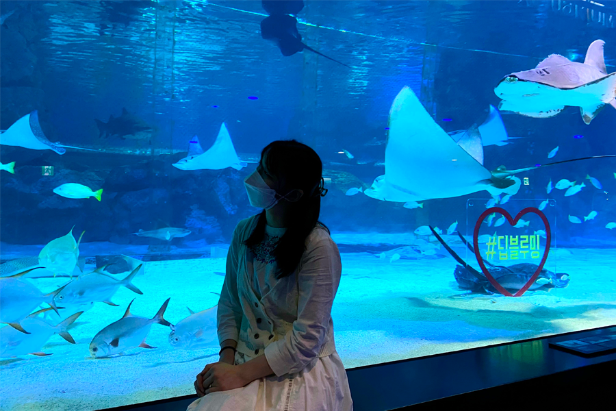 也可以來到大片玻璃組成的透明水族箱,與魟魚合影,美麗的背景是來到COEX一定要拍的打卡點。
