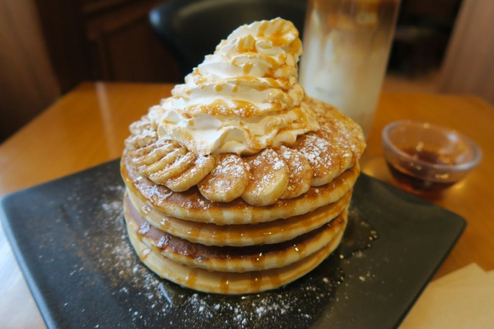 經典鬆餅是用四張鬆餅與藍莓、草莓組成,上面還撒上糖粉跟糖漿;香蕉共和國鬆餅則是加入香蕉、焦糖跟肉桂粉。