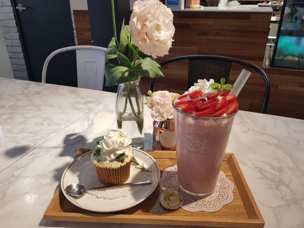 來到鮮花咖啡廳:樂賓喝的話,推薦大家可以品嘗甜甜的草莓冰沙。只要點飲品,店家就會連同美麗的花一起送上來。鮮奶油跟草莓的組合,是不是可以想像得到呢?喝一口就會讓心情變好的味道!杯子蛋糕上面也有用鮮奶油做成的花朵,非常漂亮。