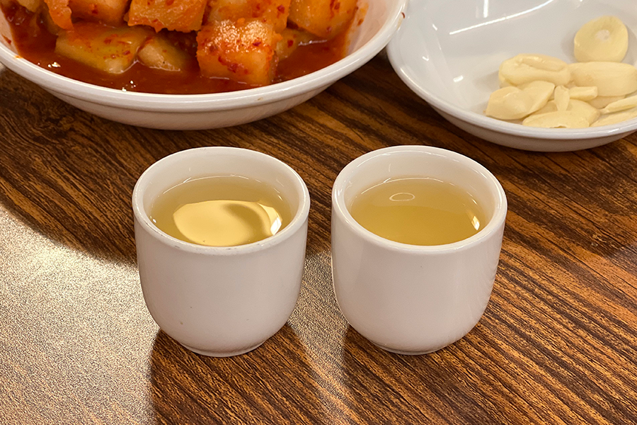 點餐後沒多久,土俗村的店員就會送上泡菜與醃蘿蔔,還有附上一杯人參酒,大家可以淺嚐,或是加入等等送上的人參雞一起吃(小編覺得單喝實在太嗆了,喝不了)。