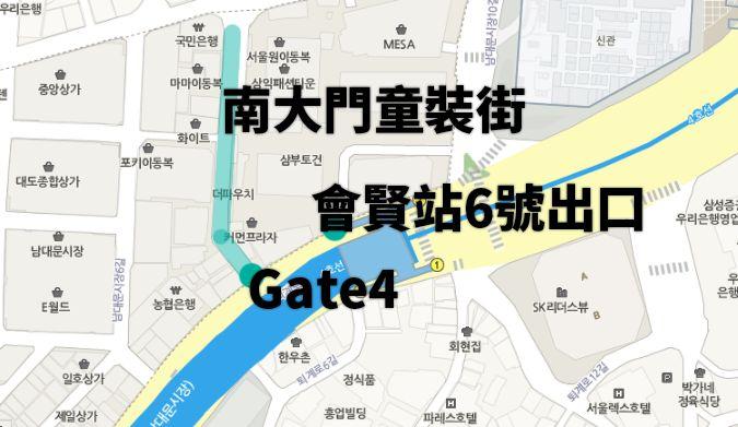 從會賢站6號出口出來後,就會看到Gate4的柱子,在這個巷子右轉進去,這一條街就都是賣兒童服飾的範圍。