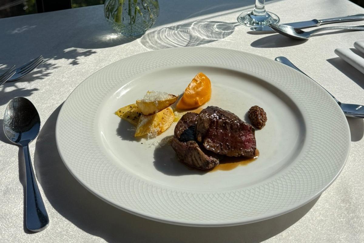 使用棕色香草奶油靜置熟成的牛排,搭配當季蔬菜配菜、自製全粒芥末醬與肉桂紅蘿蔔泥,所有元素相輔相成,完美襯托牛排本身的風味。