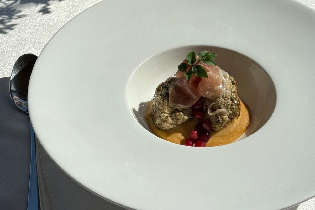 將花椰菜與鷹嘴豆基底的鷹嘴豆泥醬與洋蔥醬拌炒後炙烤,搭配石榴、帕瑪火腿,並以茉莉花葉點綴,增添清香,展現輕盈細緻的風味。
