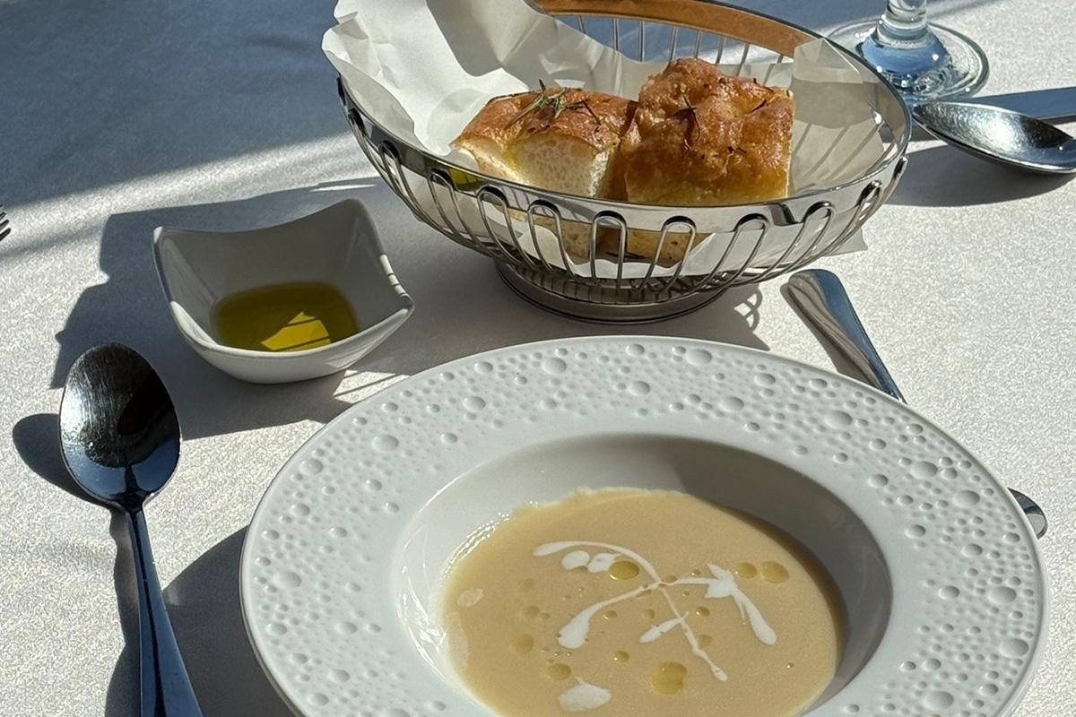蒜頭濃湯則以烤蒜與焦糖洋蔥為基底,加入迷迭香油與法式酸奶,層次豐富。