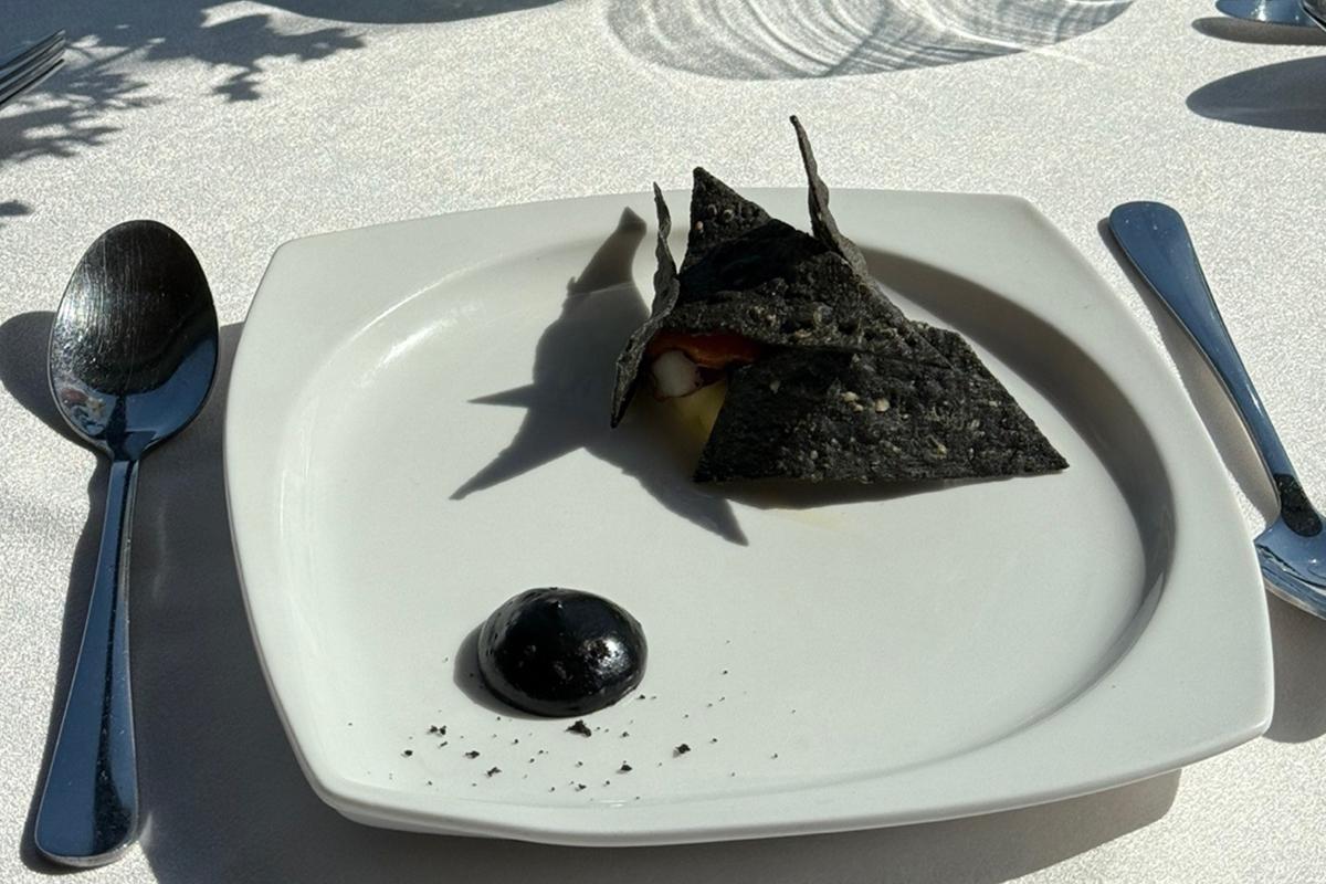 柔嫩的章魚以西班牙風格料理,搭配墨魚汁玉米脆片、濃郁的馬鈴薯泥、微辣紅蘿蔔醬、羅勒片與墨魚汁蒜味美乃滋,並灑上黑橄欖粉。透過炭油提味,帶來淡淡炭香,餘韻悠長。