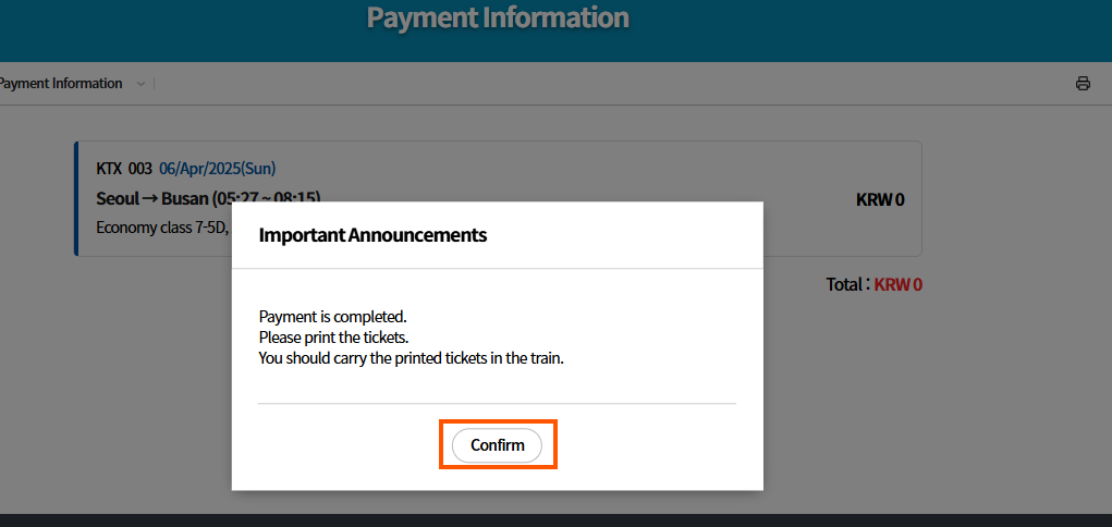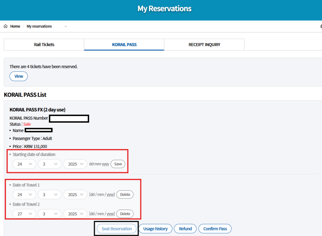 - 在KORAIL網站上輸入電子憑證上的16位數字KORAIL PASS預約號碼,並完成劃位。
