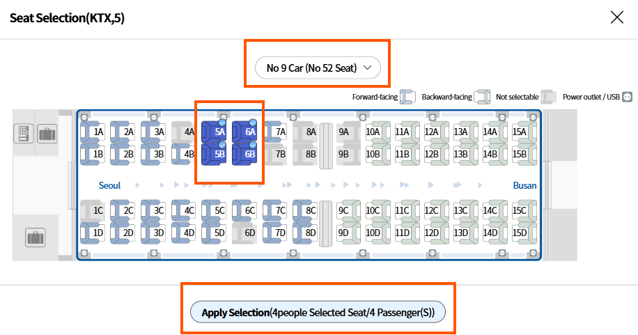- 選擇您想要的列車車廂和座位後按"Apply Selection"。