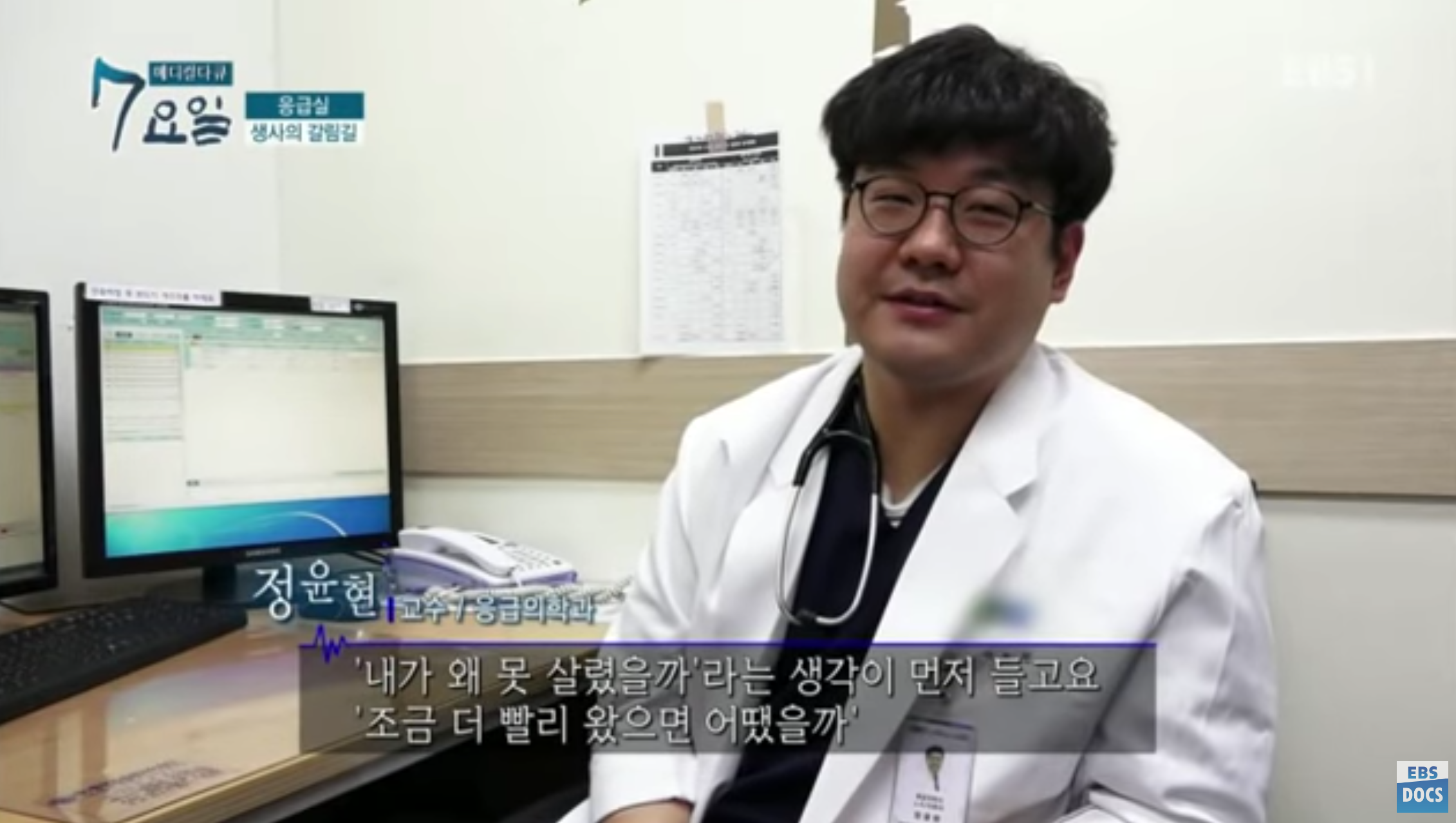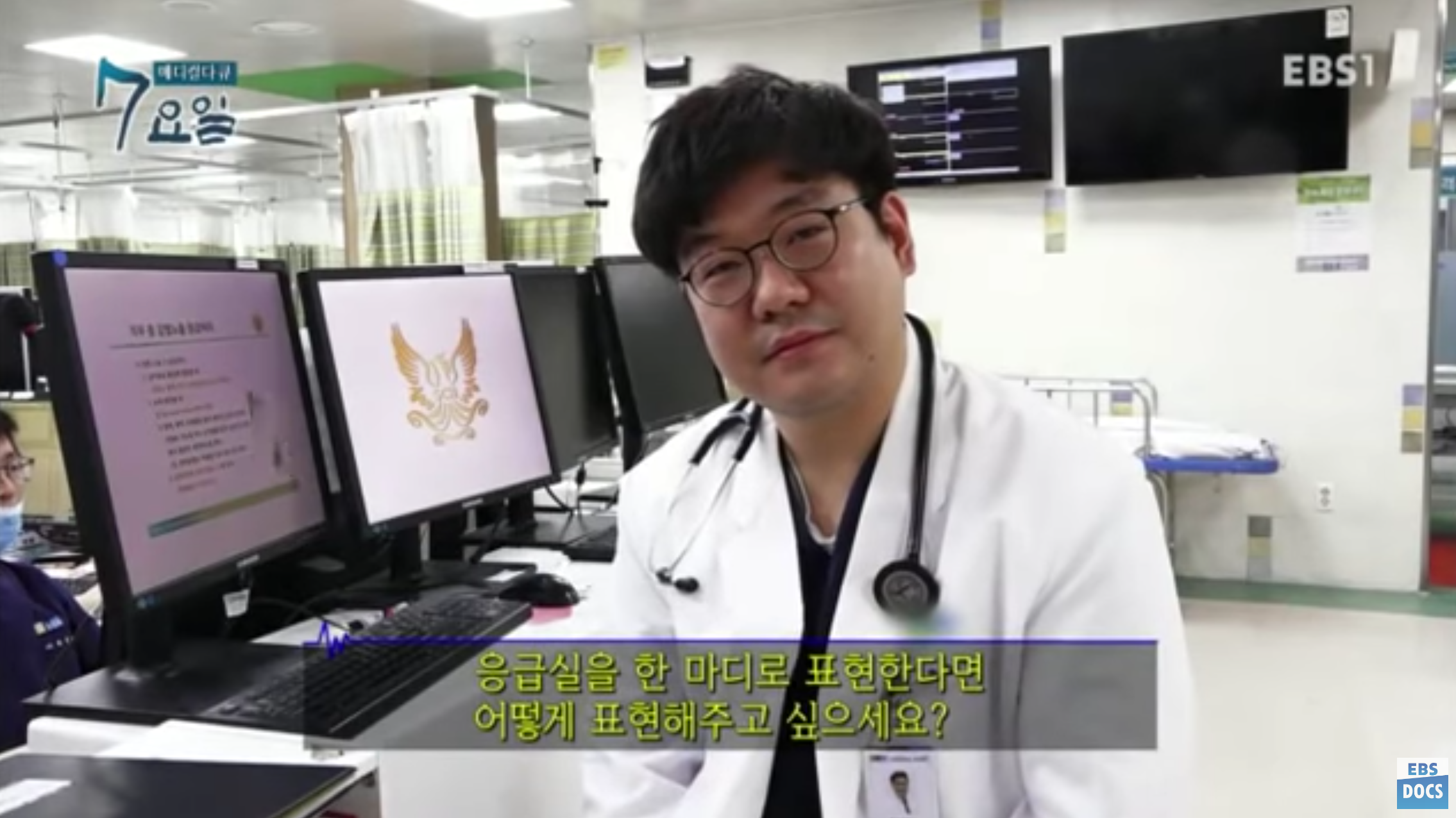 後來,節目組也對其中一位醫生鄭允賢(정윤현 音譯)進行採訪。記者問他:「如果要用一句話來形容急診室的話,您想要怎麼表達?」