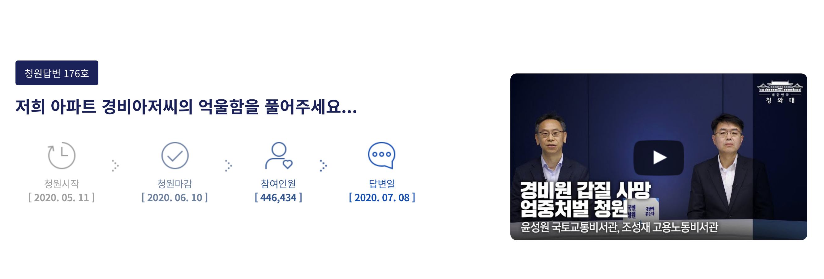 以當時震驚全韓的公寓大樓保全(管理員)自殺一事為例,不堪住戶暴虐行徑的大樓保全自殺後,引發該社區居民的串連,要求還給保全大叔一個公道,最終獲得了44.6萬名請願連署。