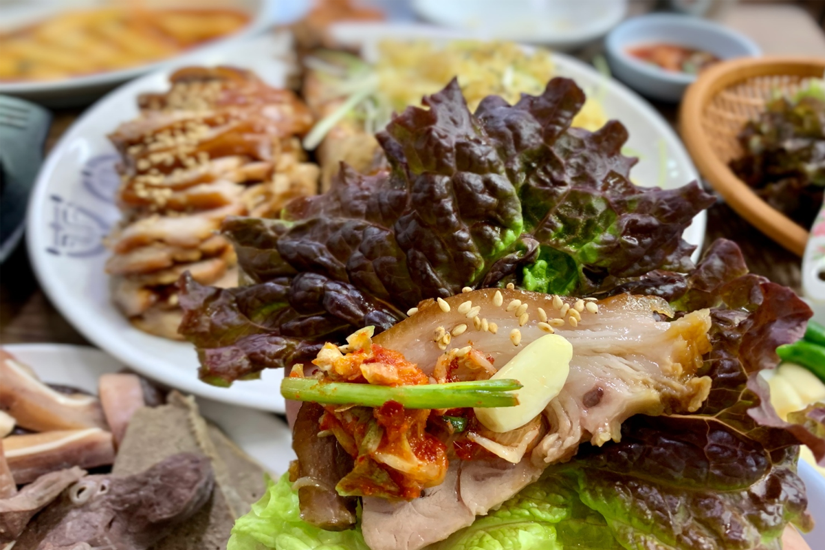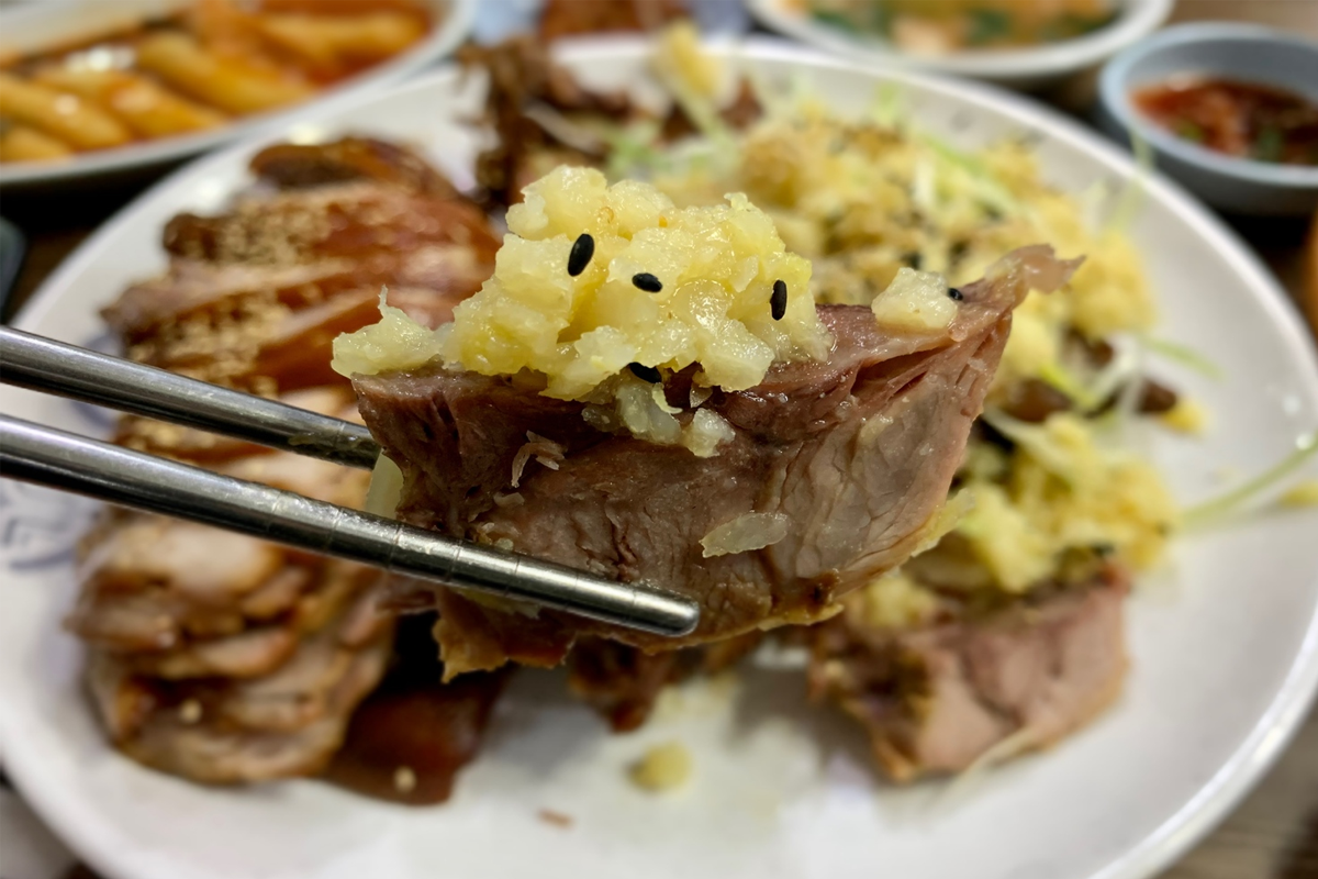 有著柔軟的筋,豬腳吃起來味道相當濃厚,鋪上蒜蓉吃也非常美味,配著泡菜、蒜頭、蝦醬、生菜包起來吃更棒。