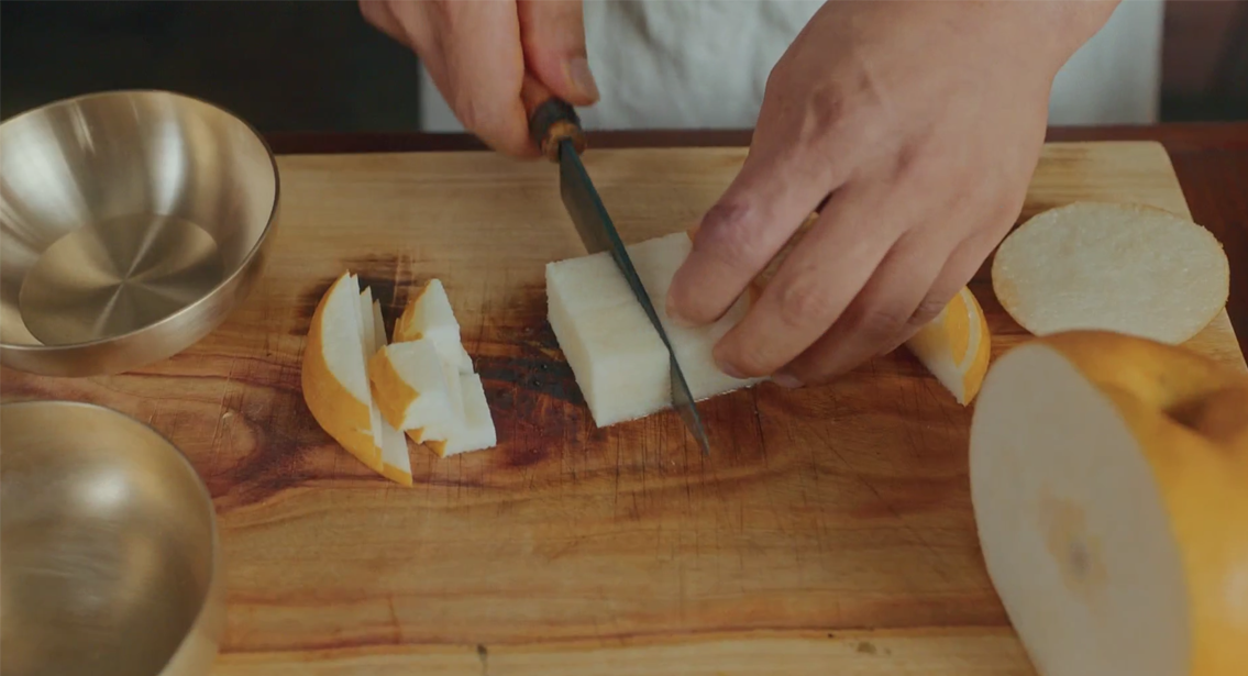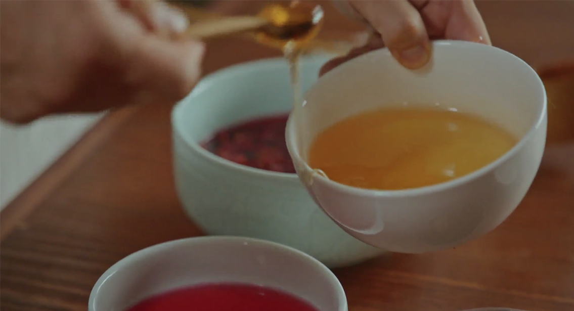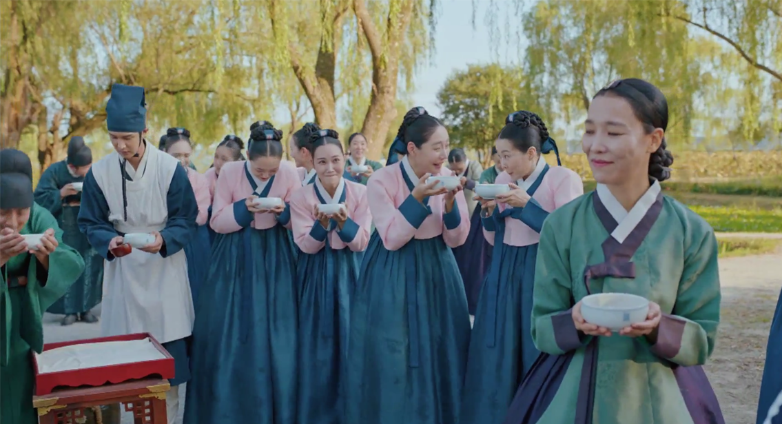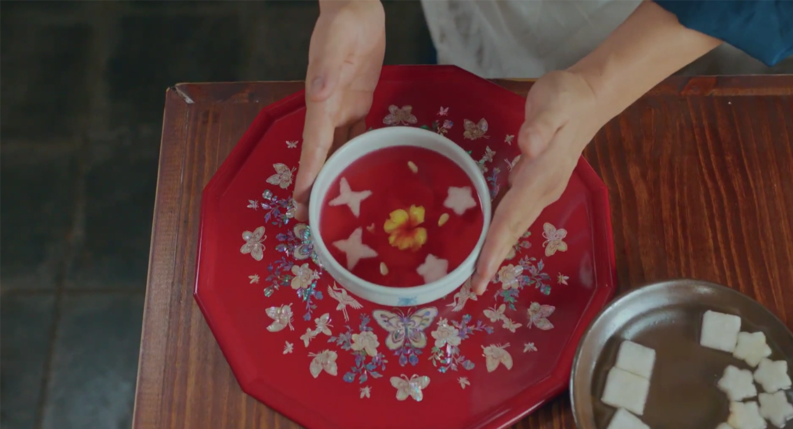而因為宮中目前沒有杜鵑花,就改以月見草的花瓣沾點澱粉,在熱水燙一下、再用涼水過一次後加入碗裡,並加入三顆松子作為畫龍點睛,美味的杜鵑花果茶就這樣完成了。大家看看宮人們欣喜的神色,是不是也很想在家自己做做看呢?