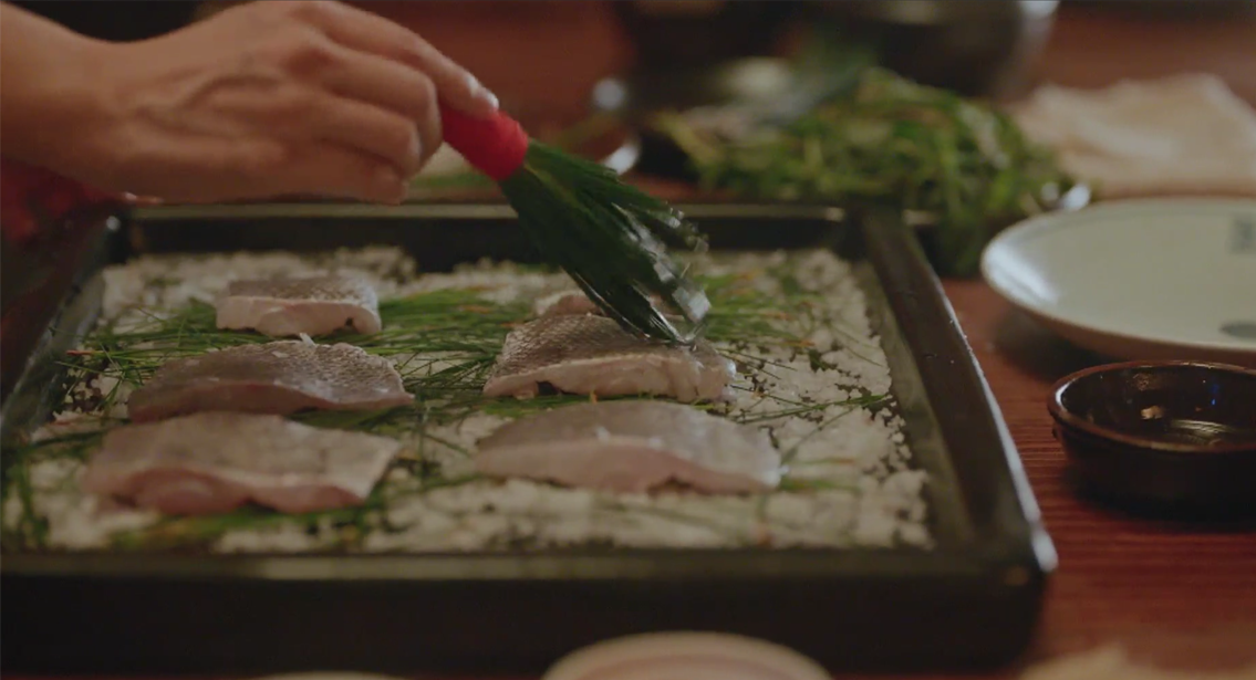 將魚肉切片處理後,鋪在灑滿粗鹽的鐵盤上,並用油薄薄地刷在魚皮上,送進烤爐中以低溫慢烘整整一晚,留住肉汁的香氣,同時也軟化肉質,吃起來完全不老。