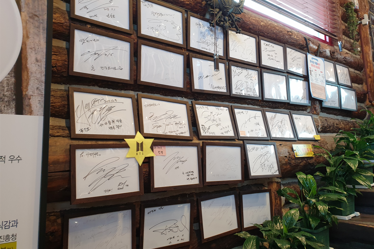 最後,在樓梯口這裡可以看到許多藝人造訪松鼠村鍋巴燉雞的簽名,其中最顯眼的,就是以黃色標誌貼在上頭的RM的簽名。