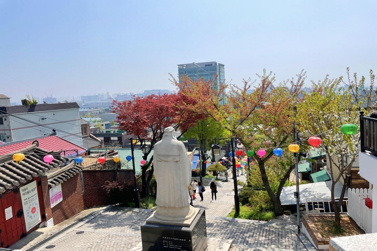 Die Statue von Konfuzius befindet sich oben an der Treppe und wenn Sie von hier aus nach links gehen, können Sie zur Samgukji Mural Street gelangen.