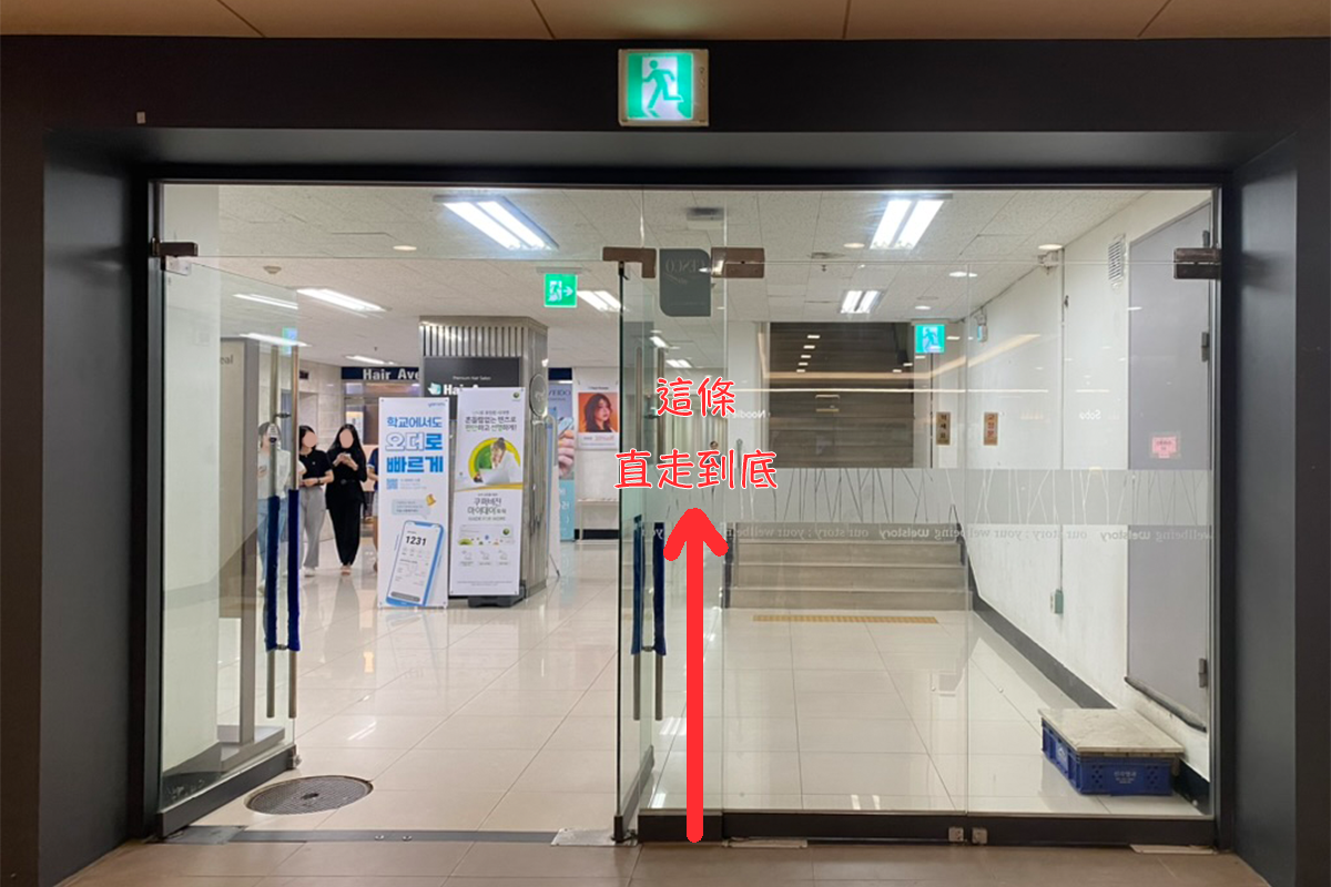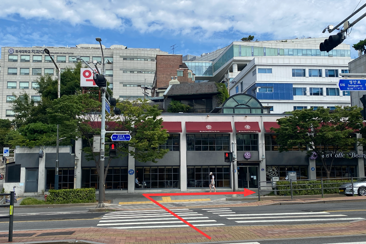 Nach dem Überqueren der Straße, gehen Sie geradeaus weiter und folgen Sie dem Coffee Bean. Wenn Sie die Pariser Baguette Bäckerei sehen, biegen Sie links ab und gehen Sie geradeaus, um das Gebäude der Sprachschule zu sehen. (Etwa 7-8 Minuten zu Fuß)