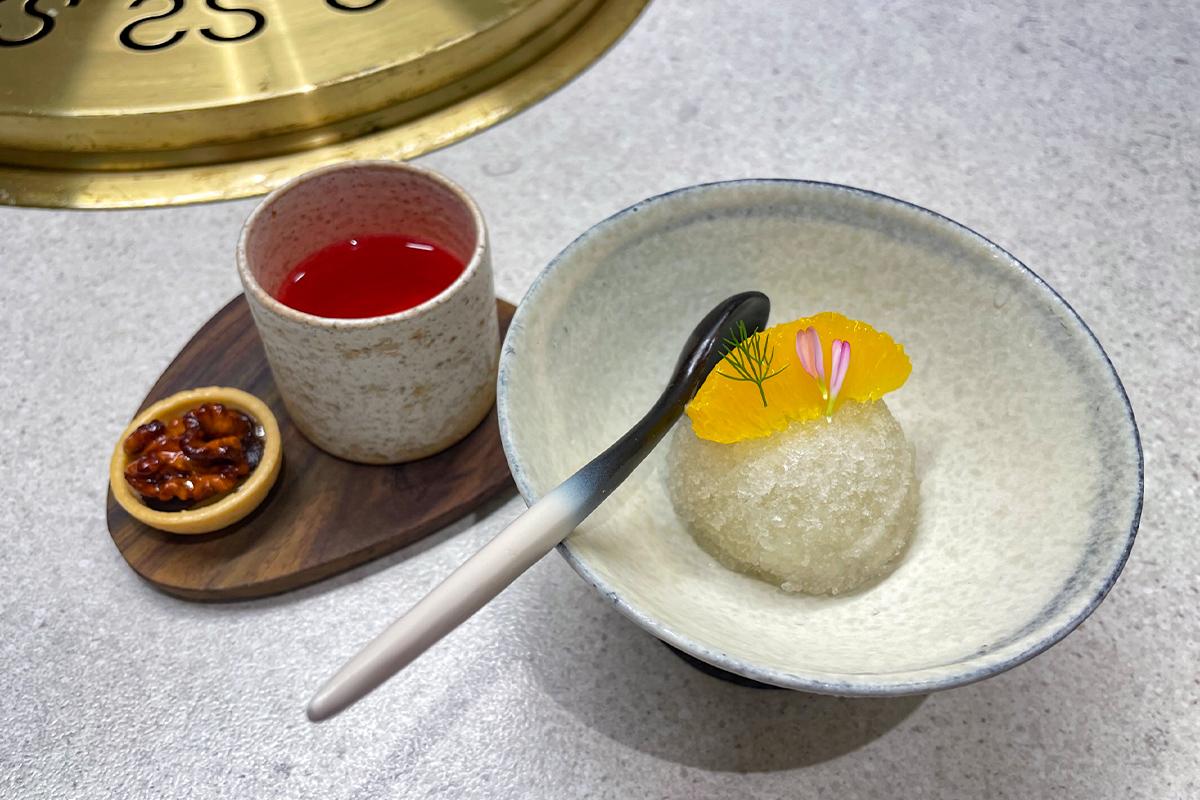 Okseolhwa erfrischte meinen Mund mit einem frischen Sorbet und einer saftigen Orangenscheibe, die sauer war. Der Dasobangwa besteht aus süßem Walnusstee und erfrischendem Omija-Tee. Obwohl der Walnusskuchen sehr süß war, konnte ich immer noch die Süße des Omija-Tees schmecken. Das Dessert war der perfekte Abschluss des Mahls!