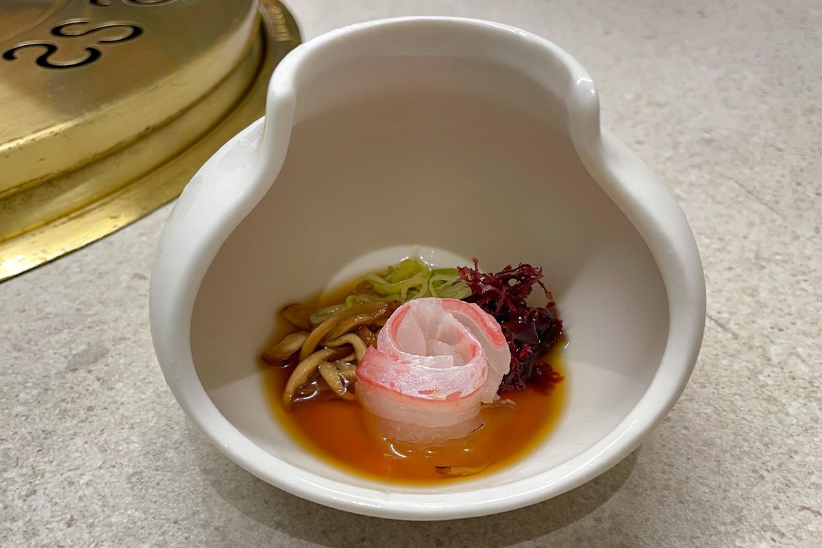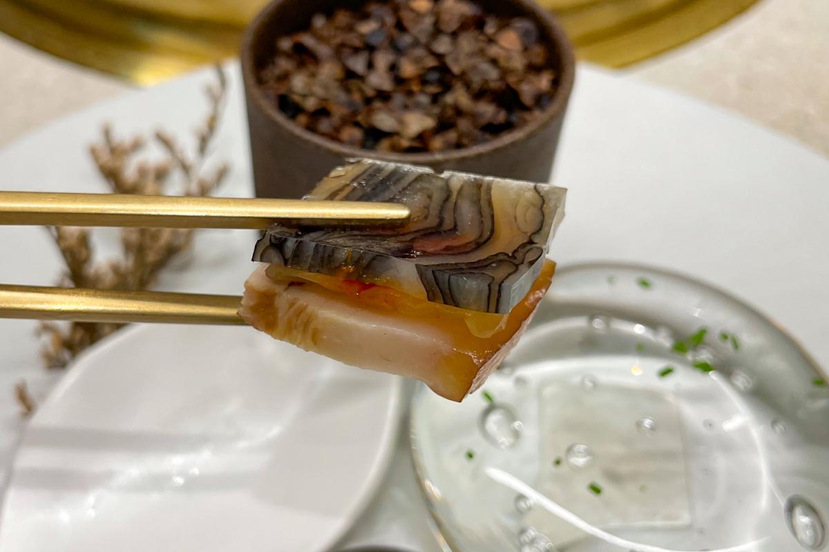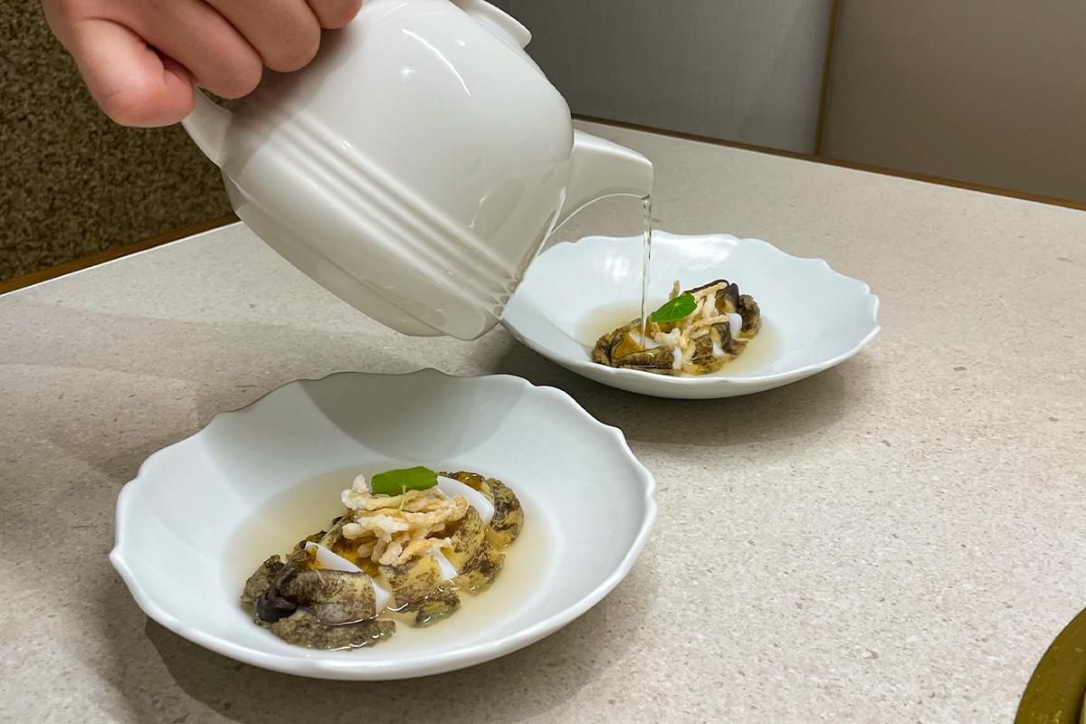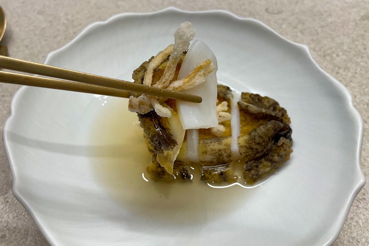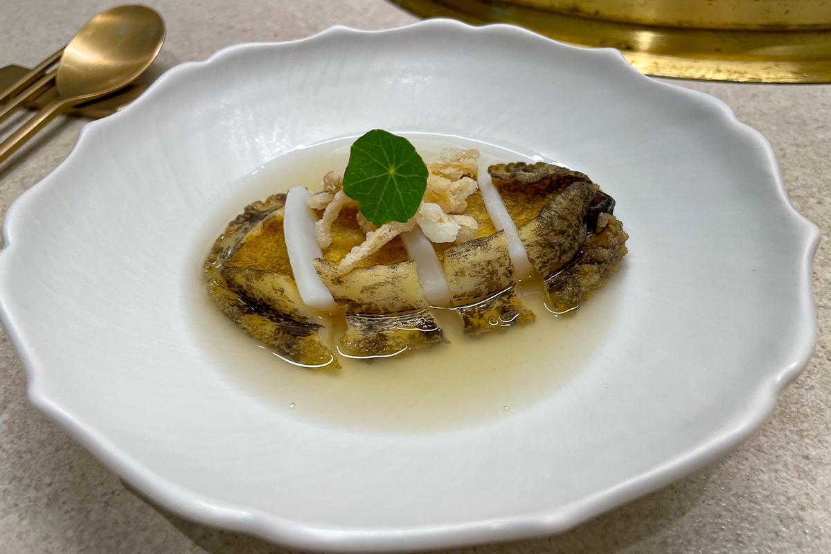 Dann kam der Alkoholgedämpfte Abalone. Diese Abalone war ein Premium-Typ, der sich von Ihrer typischen Abalone unterscheidet. Es wäre sogar schwierig, das Ganze in Ihre Faust zu passen! Dieses Gericht wird hergestellt, indem die Abalone in Alkohol gedämpft wird, und dann wurde nach dem Servieren eine Brühe darüber gegossen. Wenn mit gebratenem Tintenfisch und Pilzen gegessen, füllt die Kauigkeit des Meeresfrüchte Ihren Mund.