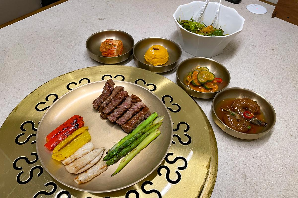 Mittagskurs B (1 Person): | Erdnuss-Kürbis-Porridge, Mokseokchohwa, Royal Fischsalat, Rindfleisch- und Garnelenpfannkuchen, Dünn geschnittenes Hanwoo Bulgogi, Saisonale Suppe, Donghwa Goldongmyeon/Gohok Naengmyeon (eine auswählen), Dasobangwa |