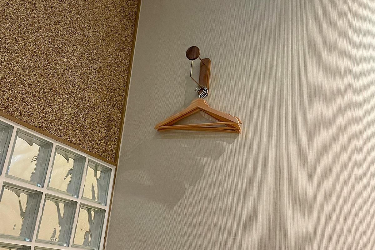 Außerdem gibt es einen Kleiderbügel an der Wand, sodass es bequem ist, schwere und dicke Mäntel im Winter aufzuhängen. Wir haben eine Reservierung für das Abendessen Kurs C für zwei Personen gemacht, also wurden wir sofort platziert und haben nur auf unser Essen gewartet, ohne eine separate Bestellung aufgeben zu müssen. Es gibt sogar ein kabelloses Ladegerät im Tisch eingebaut! Wenn Sie Ihr Telefon darauf legen, wird es automatisch aufgeladen. Es ist wirklich praktisch!