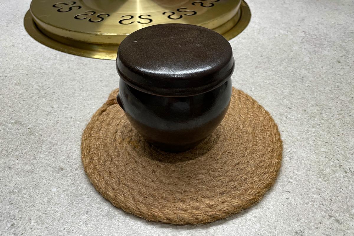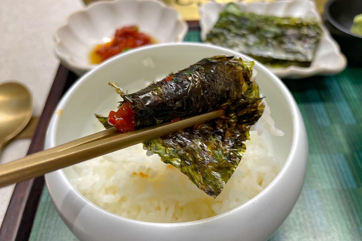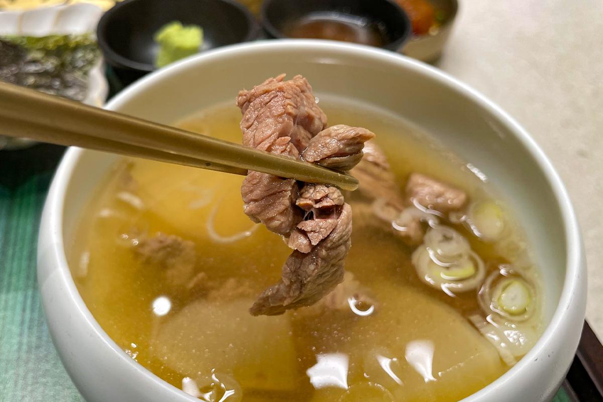 Dann wurde die saisonale Suppe serviert. Die Suppe ändert sich je nach Jahreszeit, und an dem Tag, an dem wir dort waren, war es Rinderrettichsuppe. Die Suppe wurde mit klebrigem weißen Reis, gesalzenem Oktopus und Algen serviert. Das Rindfleisch in der Suppe war koreanisches Rindfleisch (Hanwoo), und die Kombination aus Hanwoo, Rettich und der Würze ließ den tiefen Geschmack der Suppe noch mehr hervorstechen.