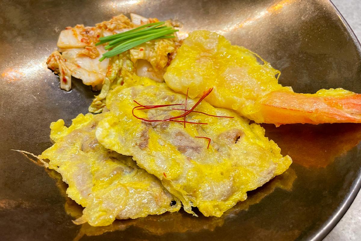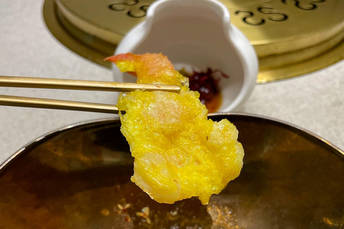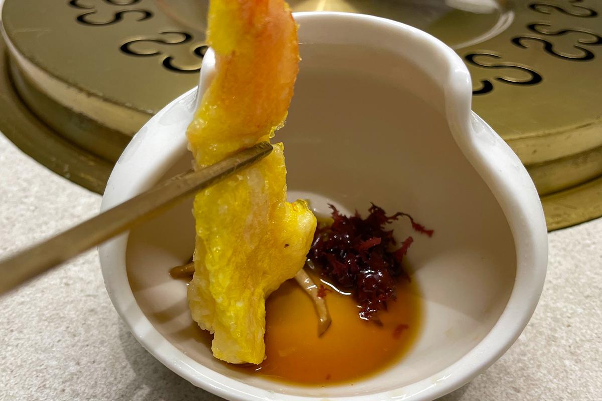 Sie können den Garnelenpfannkuchen auch in der übrig gebliebenen Sojasauce vom Königsfischsalat eintauchen. Die Garnelen waren prall und zäh, und das Aroma der Sojasauce passte gut dazu.