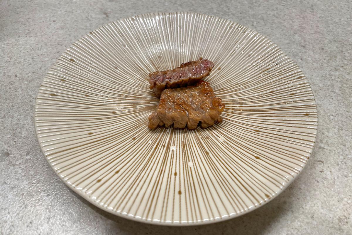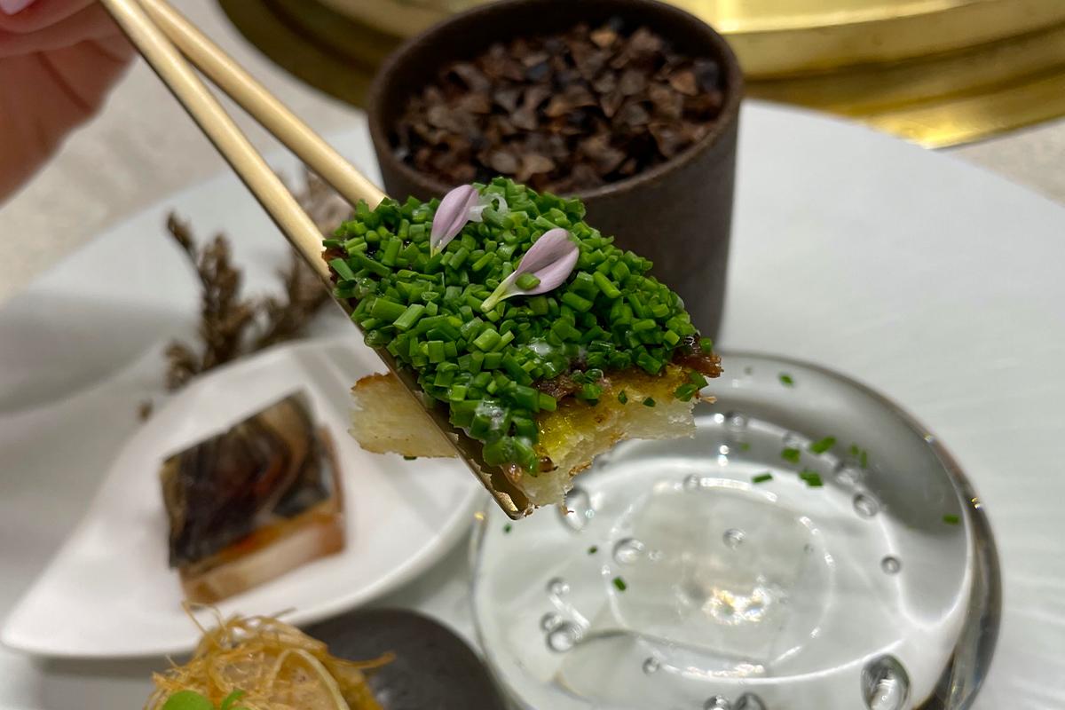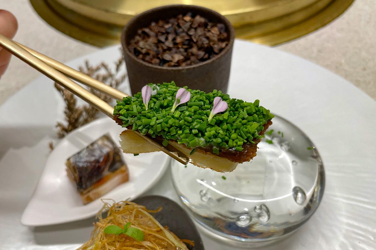 Als nächstes gab es ein Mini-Trüffel-Kurzrippen-Sandwich, das mit dünn gehacktem Schnittlauch und essbaren Blumen garniert war.
