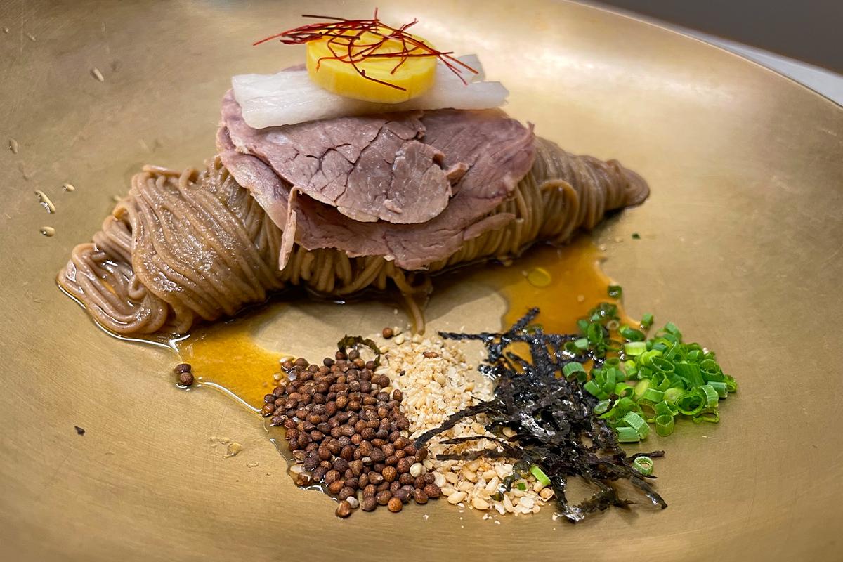 Dieses Gericht wird mit Jeju Buchweizennudeln kombiniert mit Rindfleisch, Eiern, ganzen Sesamsamen und schwarzen Sesamsamen serviert.