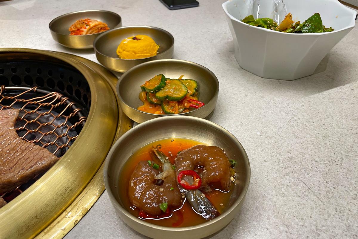 Es kommt auch mit Beilagen, die perfekt zum Essen mit den Short Ribs sind. Die gewürzten Sesamblätter und die Gurkenbeilage waren besonders ausgezeichnet.