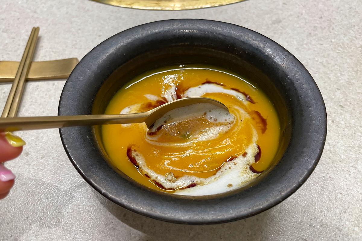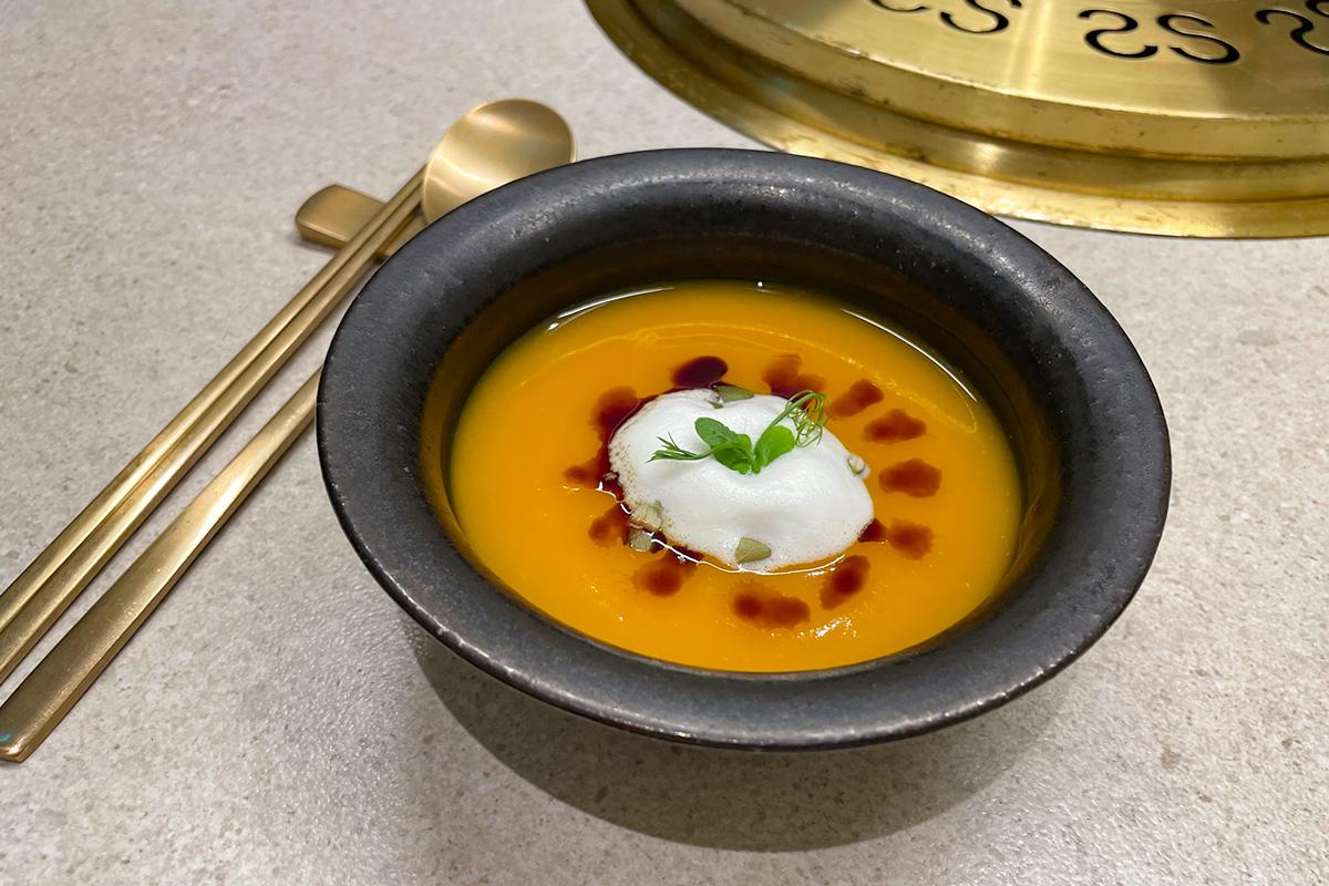 Die Vorspeise war ein Erdnuss-Kürbis-Brei. Es wird mit Sahne und Kürbiskernöl getoppt, das mit dem Brei gemischt werden kann. Bitte beachten Sie, dass Sie es schnell umrühren sollten, bevor die Sahne sich absetzt. Wenn Sahne und Brei zusammen gemischt sind, fügt es dem Kürbisbrei einen extra Löffel Weichheit hinzu.