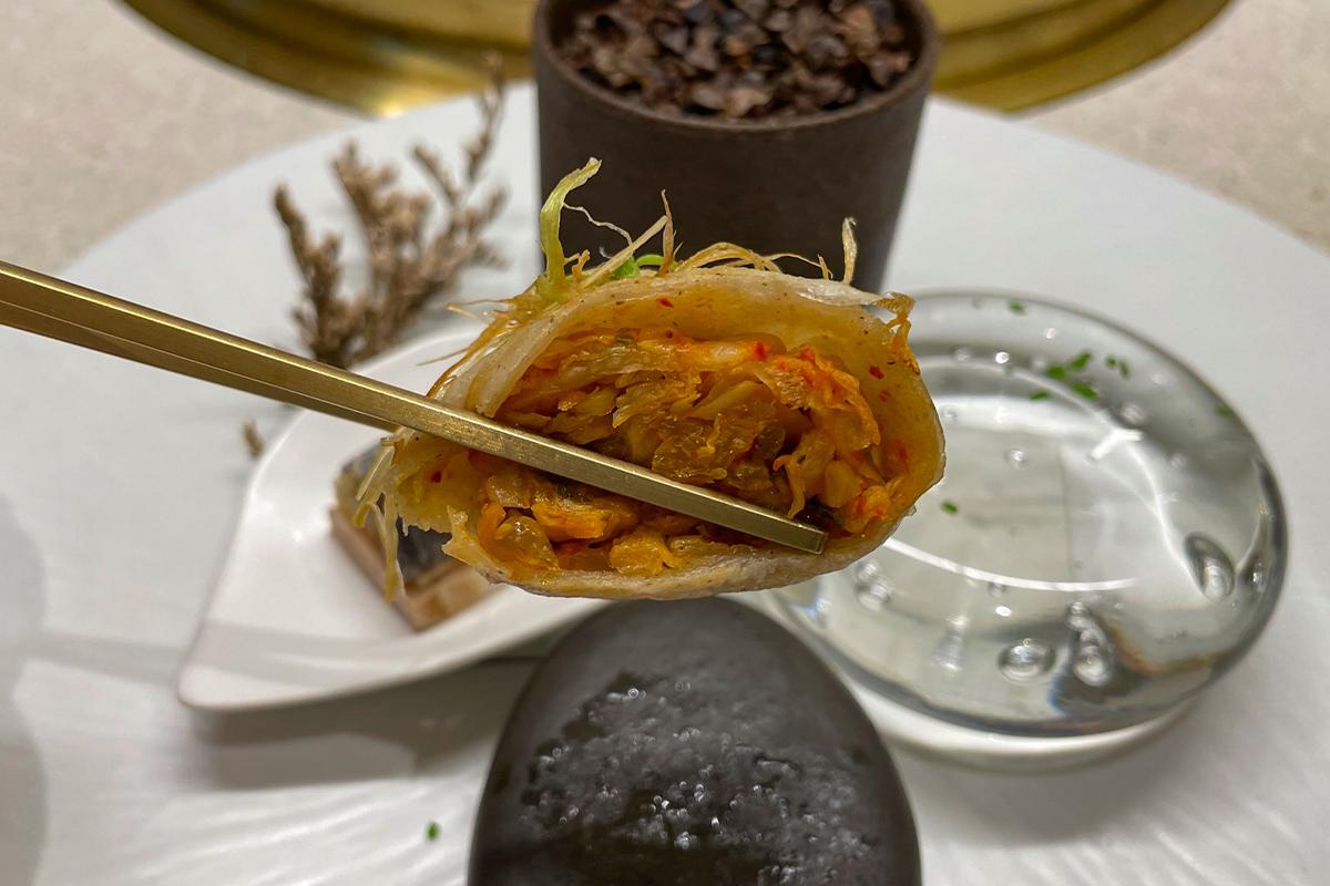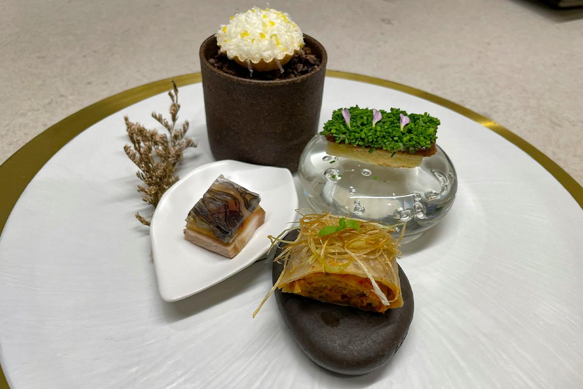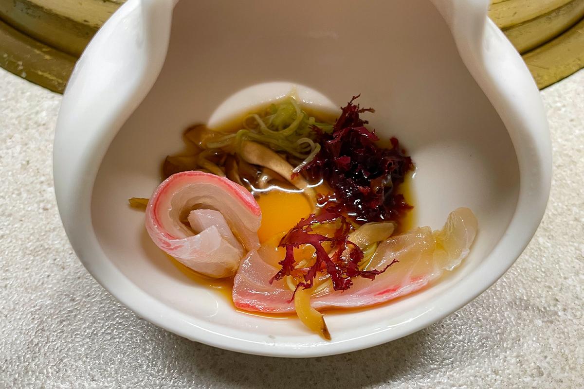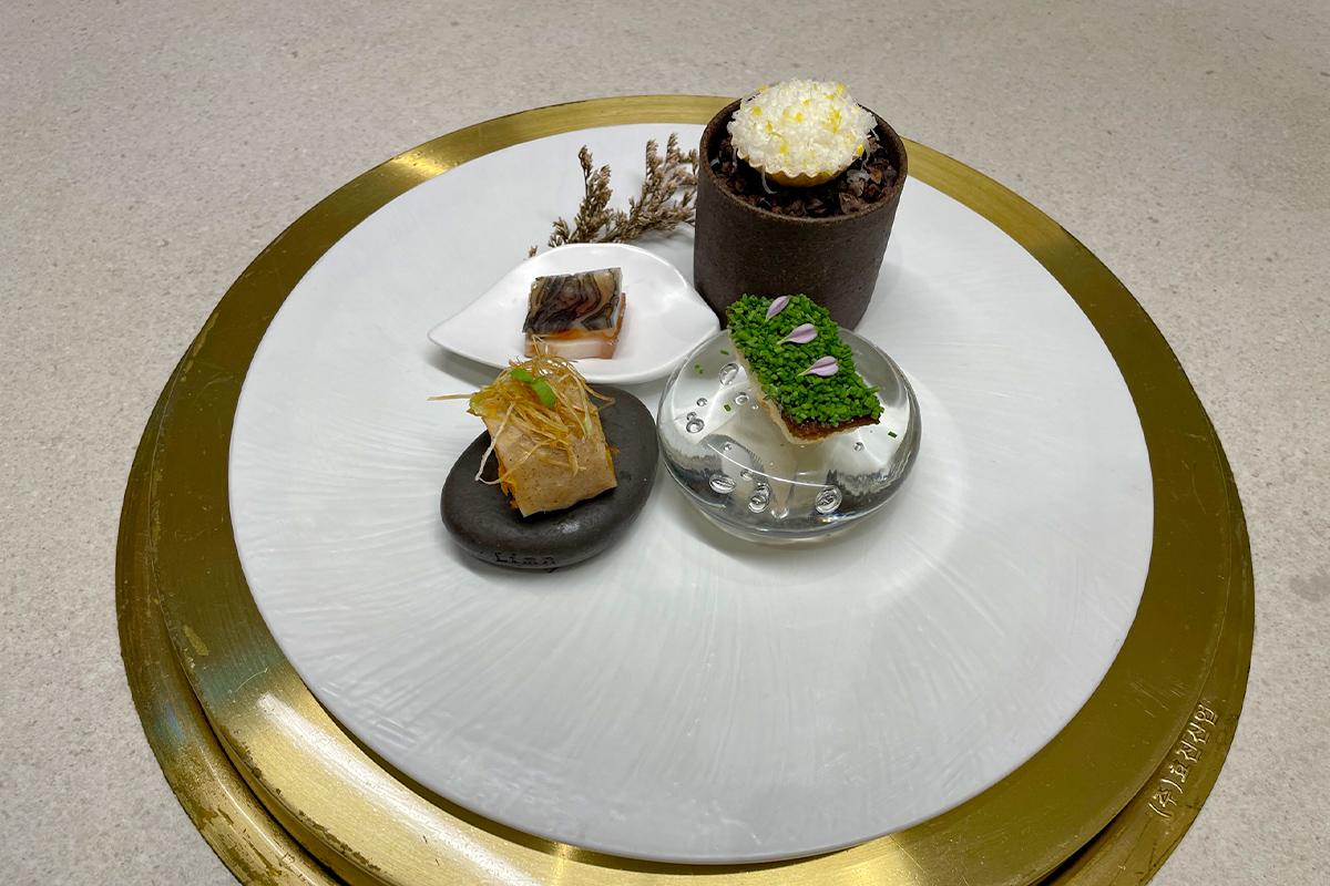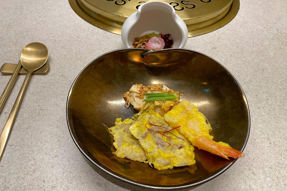 Das nächste Gericht ist ein Vier-Komponenten-Gericht namens Mokseokchohwa. Dieses Gourmet-Gericht wurde mit raffinierten Gerichten und Dekorationen geliefert, die dem visuellen Reiz des Essens entsprachen. Das erste, was ich aß, war eine Torte, die hoch stand, mit Kabeljau, Käsepulver und Zitronenschale.