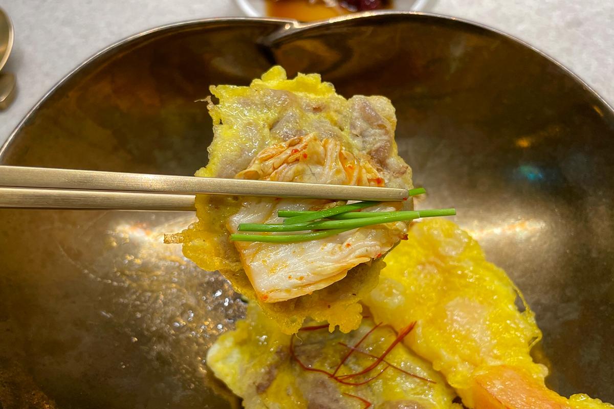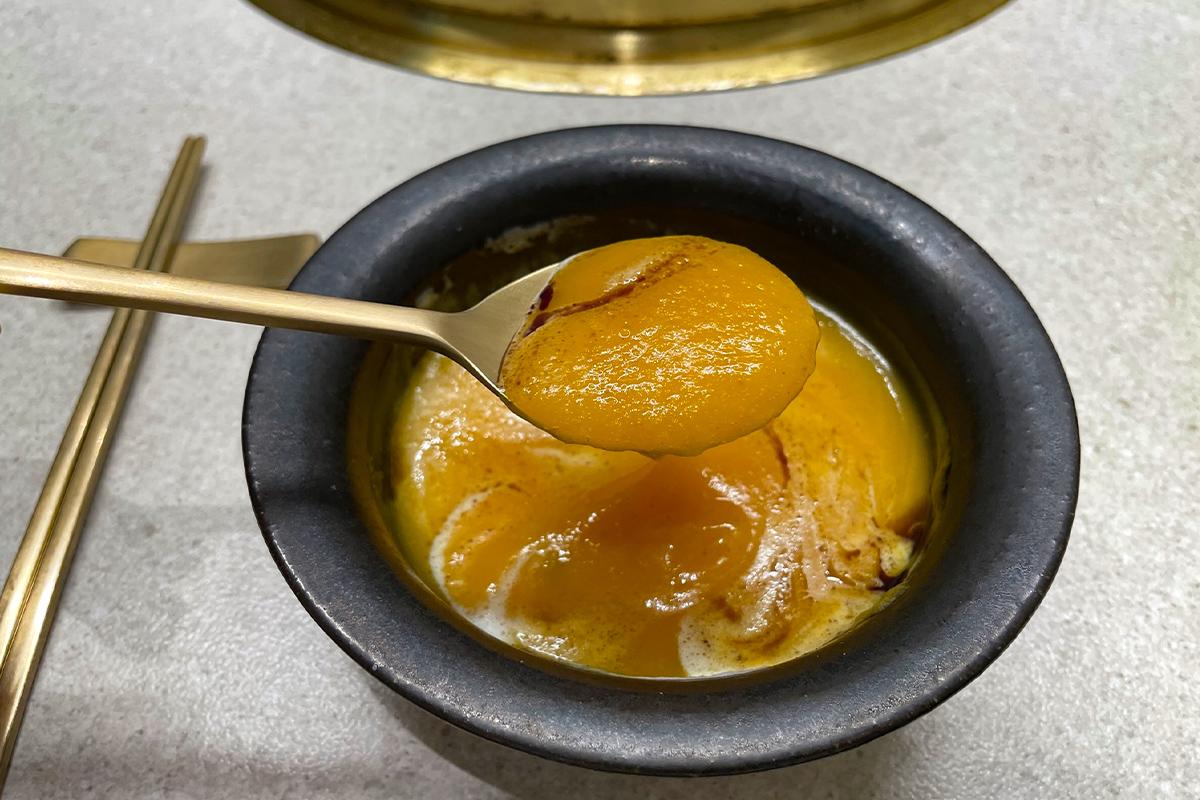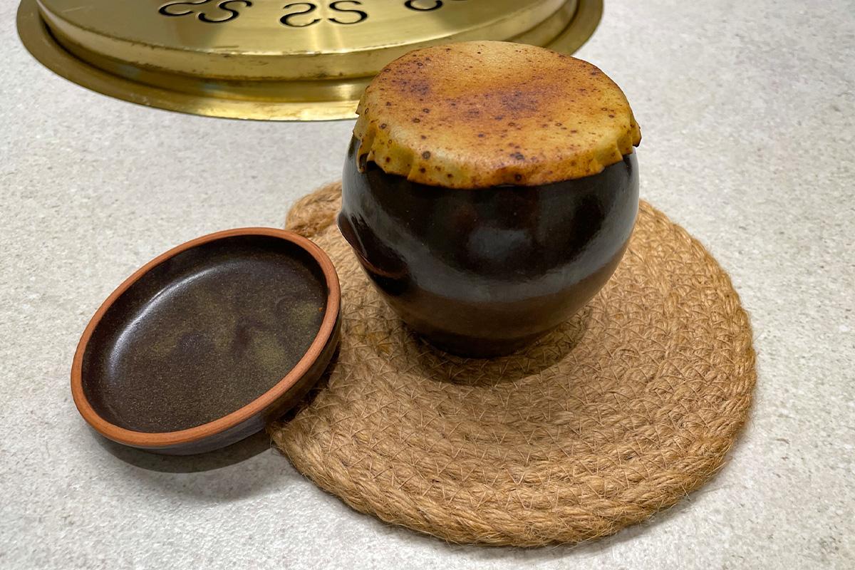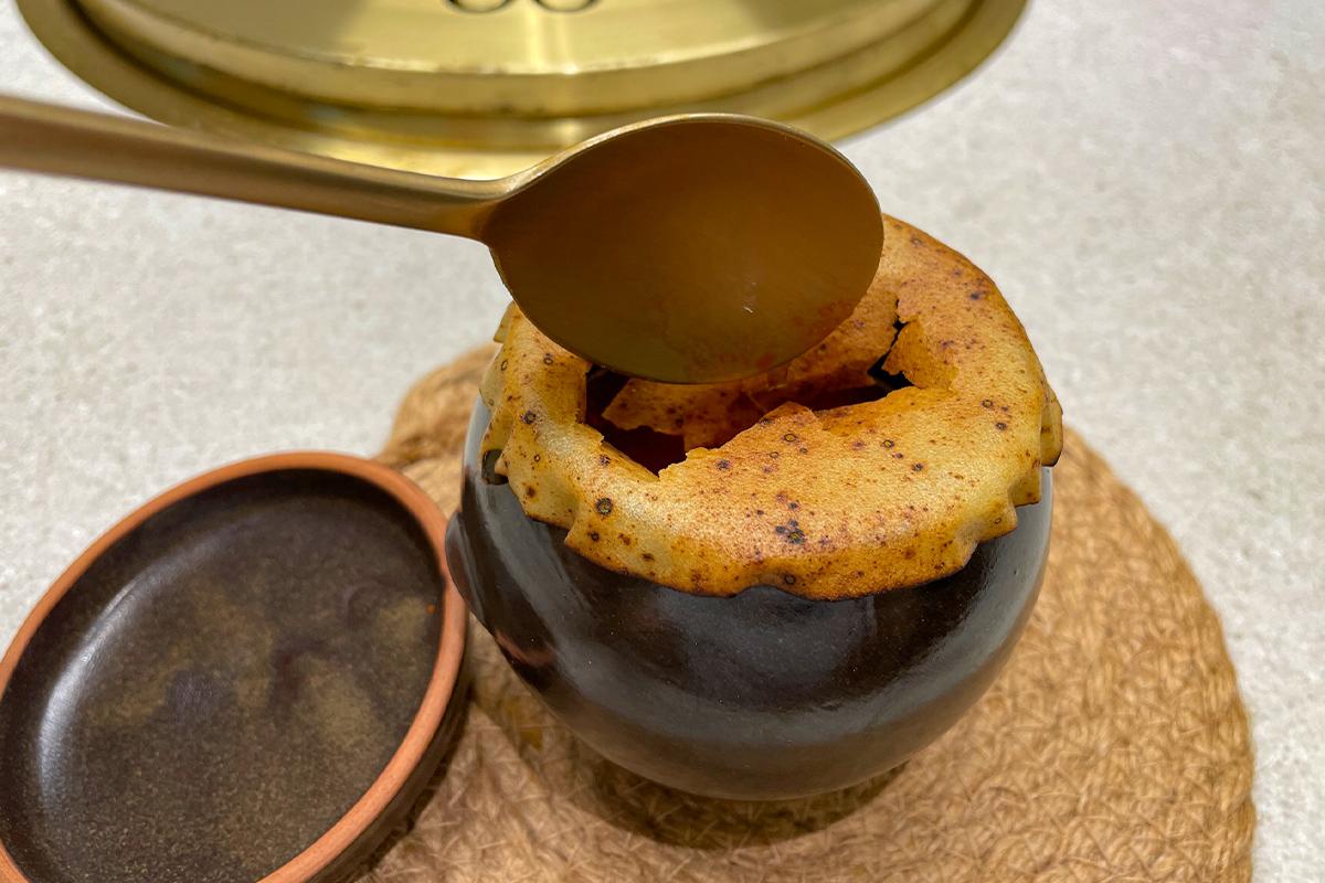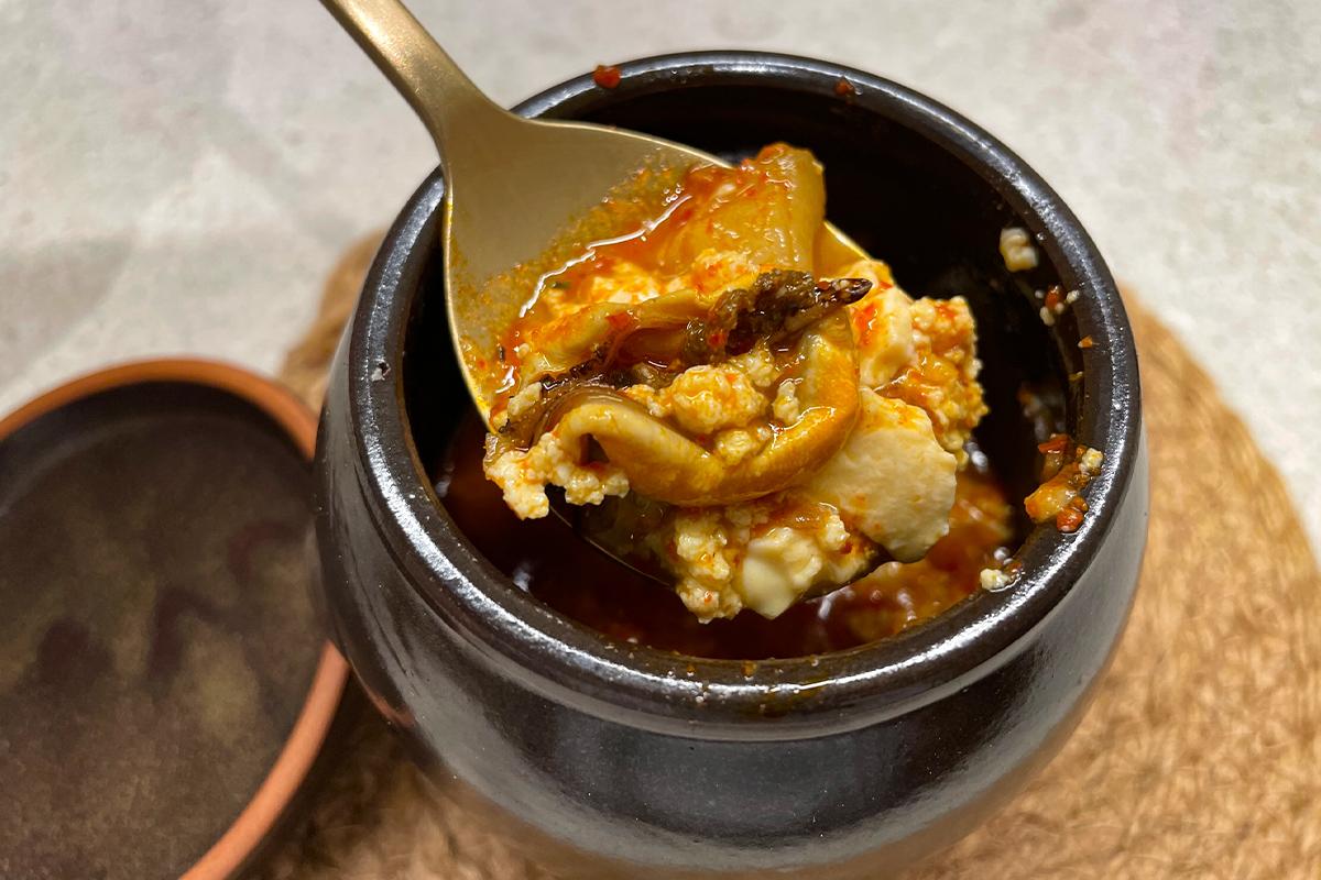 Als Nächstes kam der Meeresfrüchte-Soft-Tofu-Tontopf, ein würziger Meeresfrüchtesuppen-Tofu, der in einem Mini-Topf serviert wurde. Das Anrichten war wirklich einzigartig und wurde sogar mit einer dünnen Schicht Kartoffel getoppt.