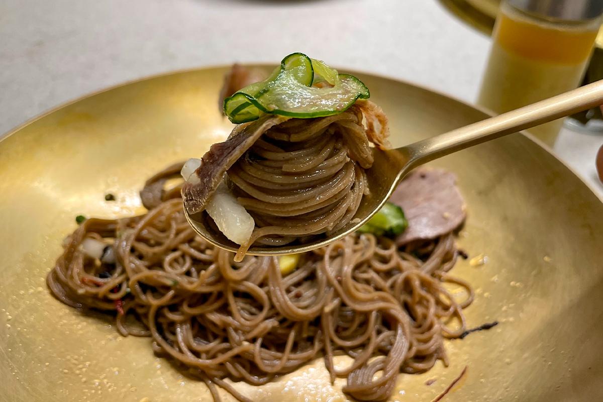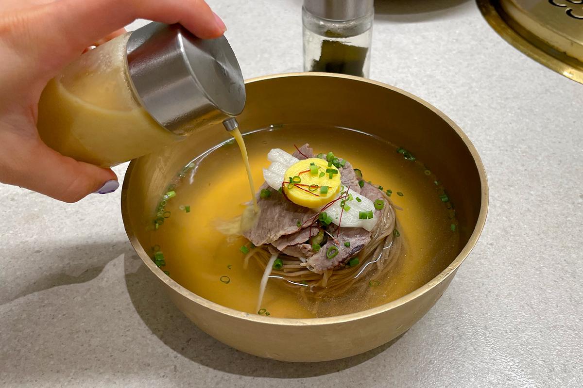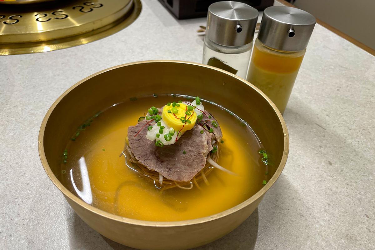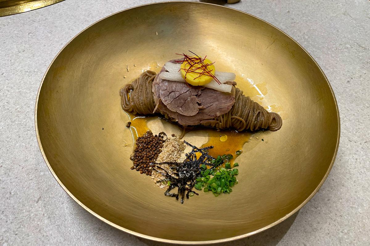 Für den Abschlusskurs können Sie zwischen zwei Arten von kalten Nudeln wählen, Gohok Naengmyeon und Donghwa Goldongmyeon, also haben wir jeweils eine bestellt. Das Naengmyeon war sehr erfrischend und wurde mit Jeju Buchweizennudeln und Lammbrühe zubereitet. Das Personal informierte uns, dass es im Wesentlichen dasselbe wie Pyongyang Cold Noodles ist! Selbst wenn Sie Senf und Essig hinzufügen, hat es vielleicht keinen Geschmack, aber wenn Sie Pyongyang Naengmyeon mögen, empfehlen wir es!