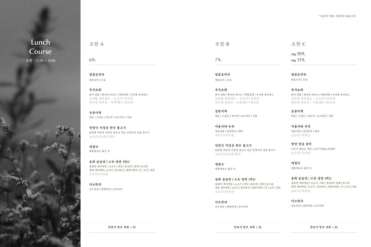 Mittagskurs A (1 Person): | Erdnuss-Kürbis-Porridge, Mokseokchohwa, Royal Fischsalat, Dünn geschnittenes Hanwoo Bulgogi, Saisonale Suppe, Donghwa Goldongmyeon/Gohok Naengmyeon (eine auswählen), Dasobangwa |