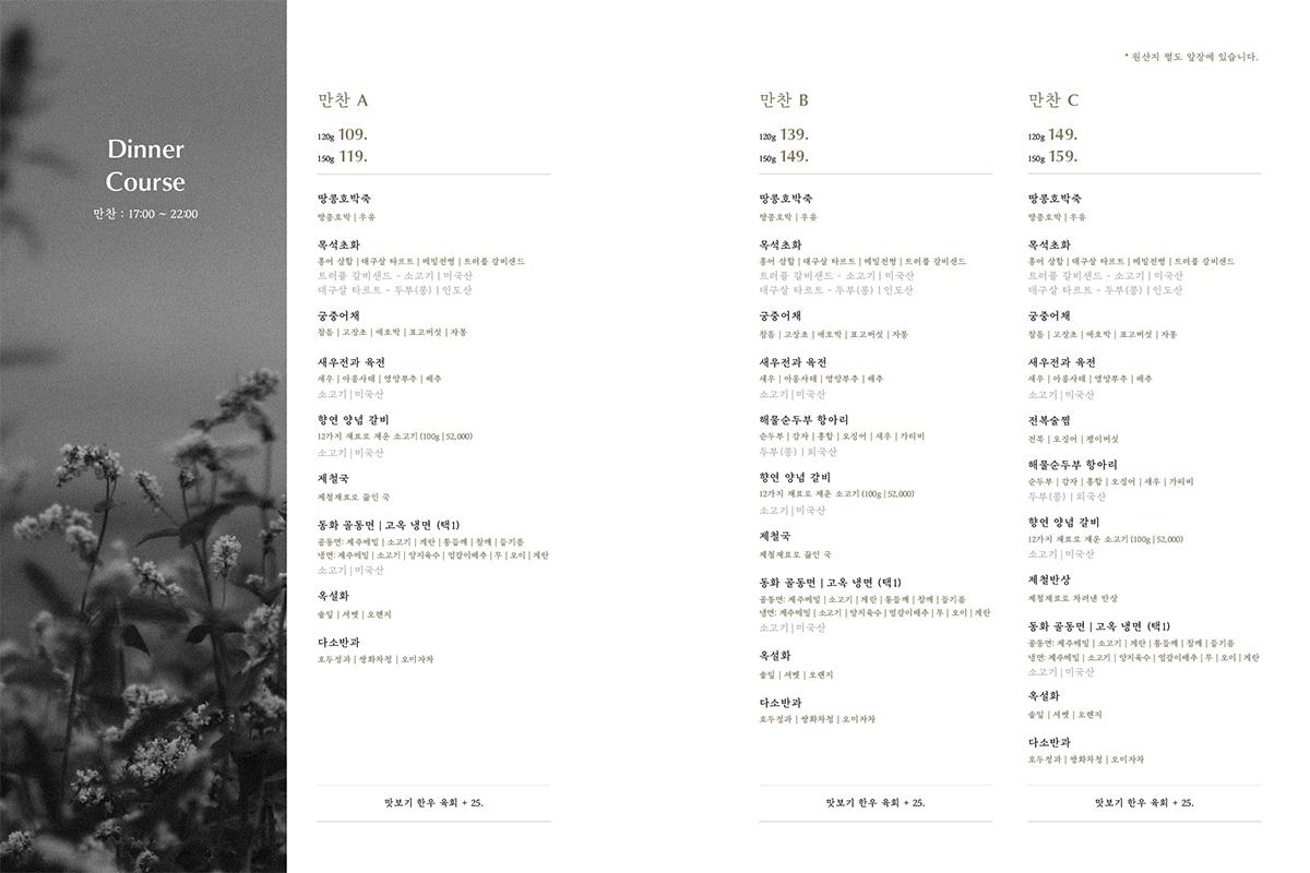 Abendkurs C (1 Person): | Erdnuss-Kürbis-Porridge, Mokseokchohwa, Royal Fischsalat, Rindfleisch- und Garnelenpfannkuchen, Alkohol gedämpfte Abalone, Meeresfrüchte-Tofu-Suppe, Marinierter Bankett-Kurzrippen, Saisonale Suppe, Donghwa Goldongmyeon/Gohok Naengmyeon (eine auswählen), Okseolhwa, Dasobangwa |