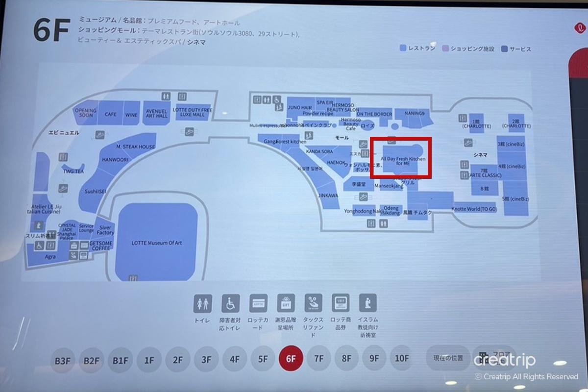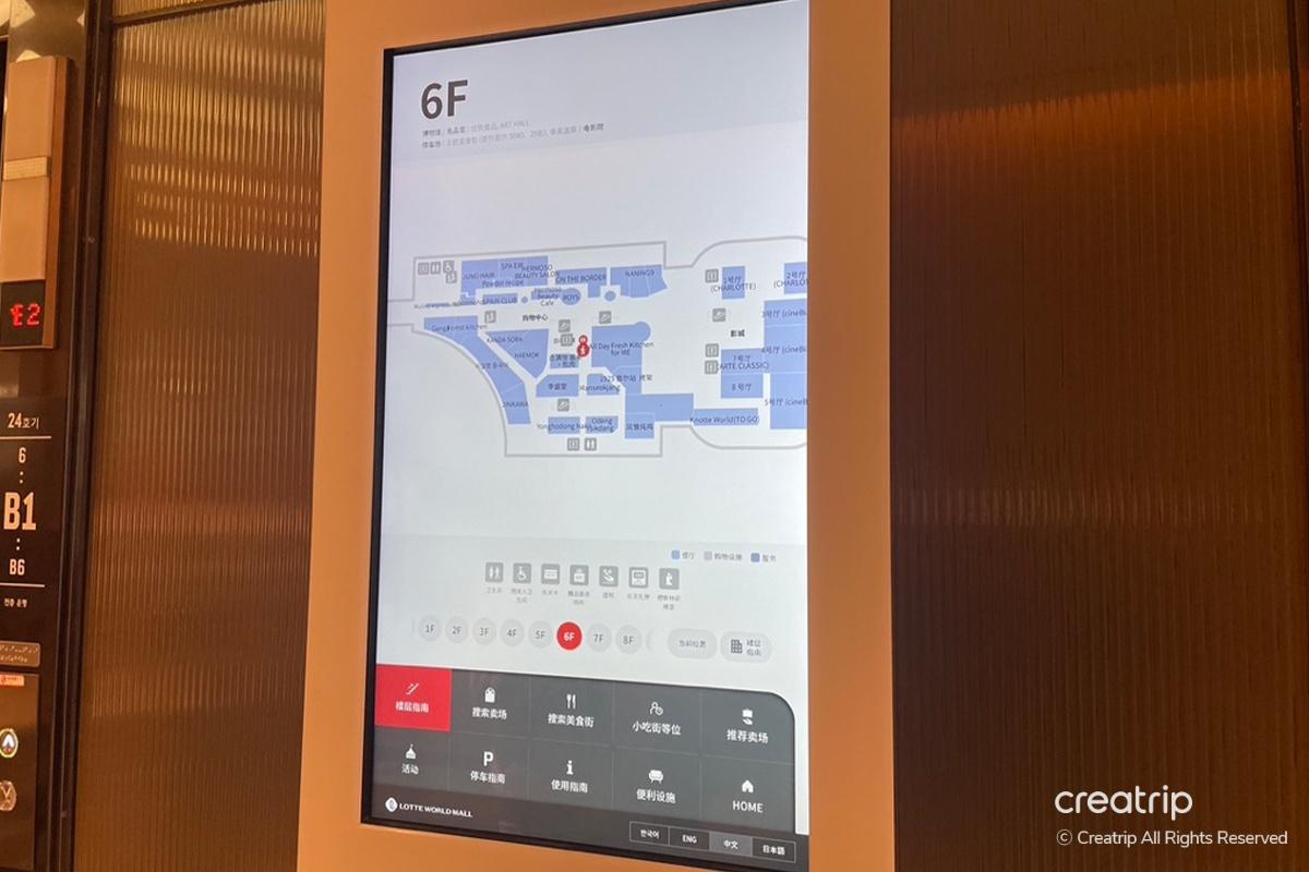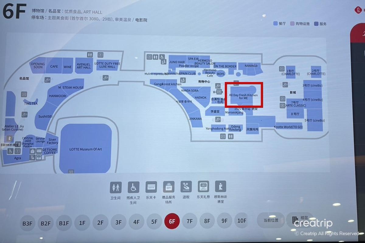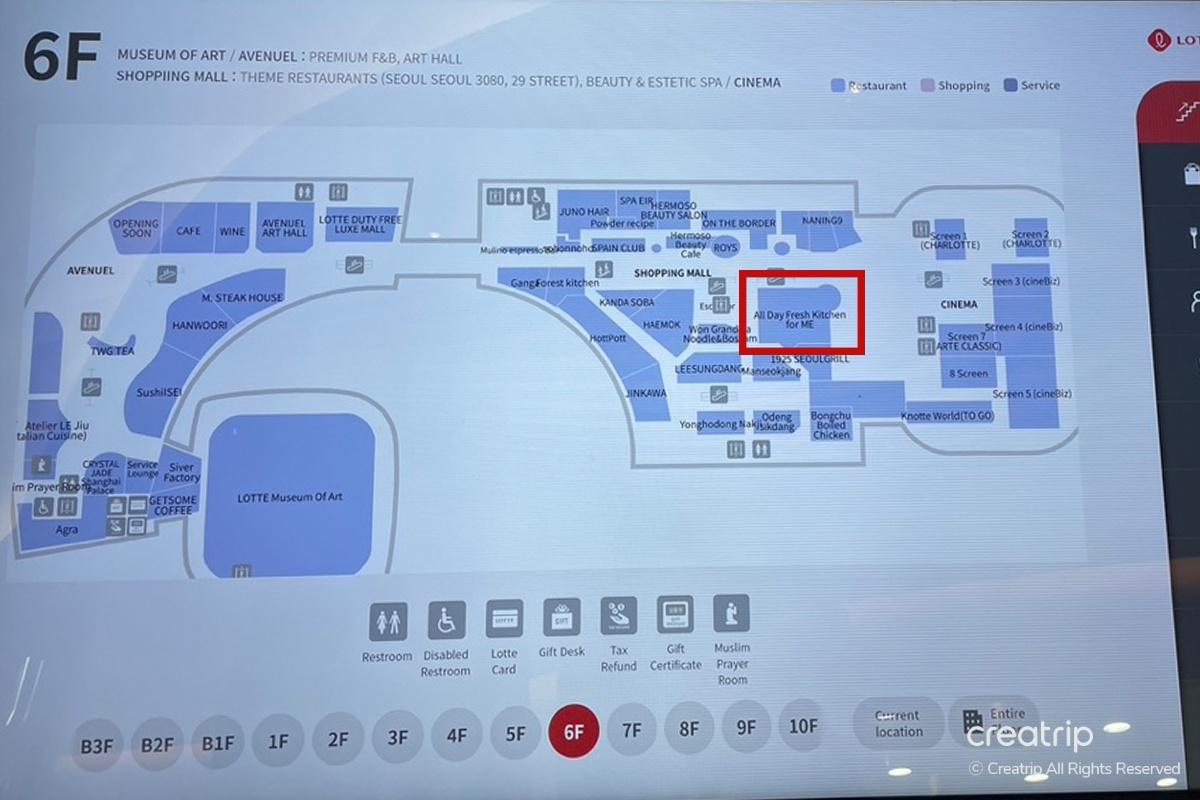 Sobald Sie die Rolltreppe in den 5. Stock nehmen, sehen Sie das Lotte Cinema. Drehen Sie sich um, und Sie finden den All Day Fresh. Nehmen Sie die Rolltreppe, die auf allen Etagen fährt, um in den 6. Stock zu gelangen.