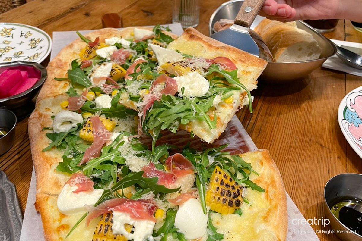 Corn Burrata Pizza bietet einen herzhaften, im Ofen gebackenen Teig, der mit süßem Mais, geräuchertem Lachs und cremigem Burrata-Käse belegt ist. Der Mais und die großzügigen Portionen Burrata-Käse ergänzen perfekt die Harmonie des Pizzateigs und des klebrigen Käses.