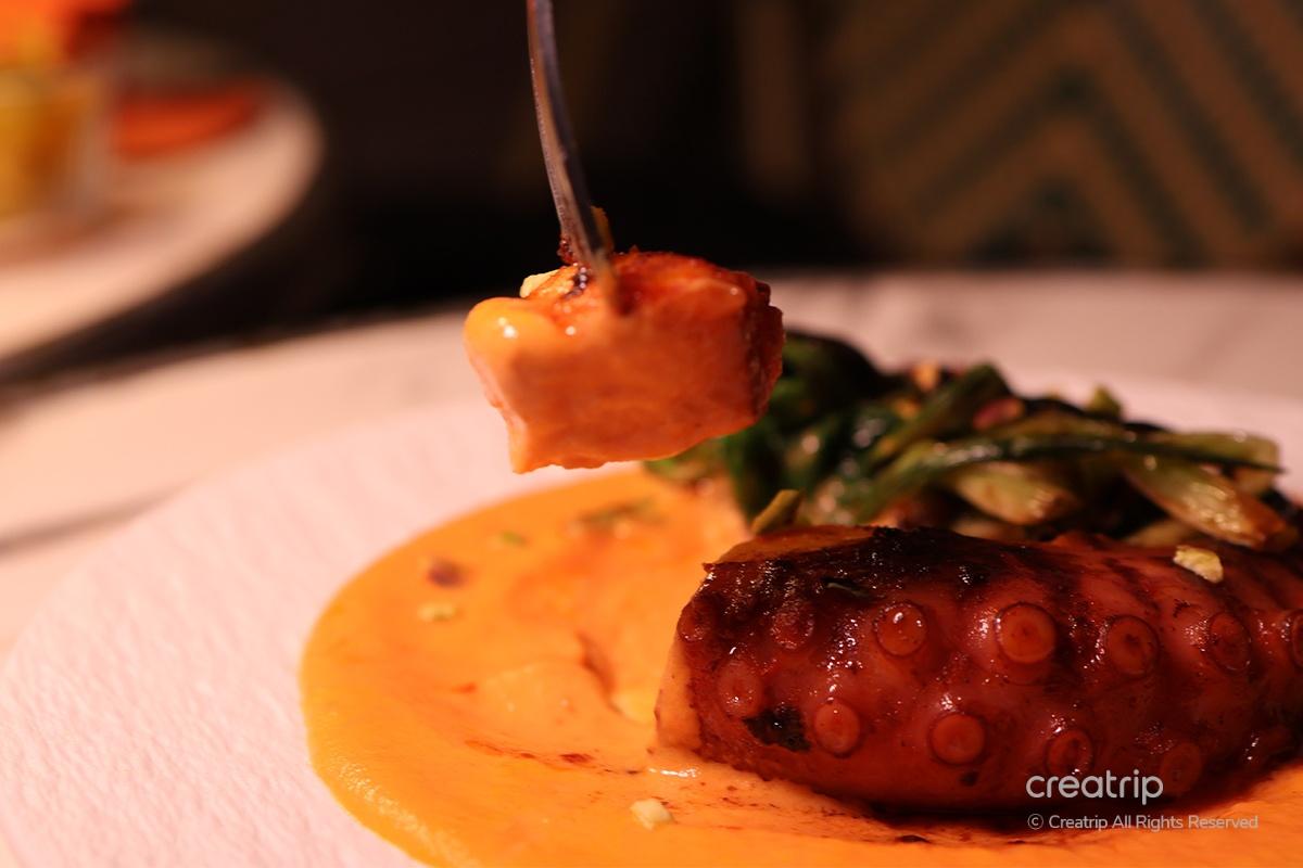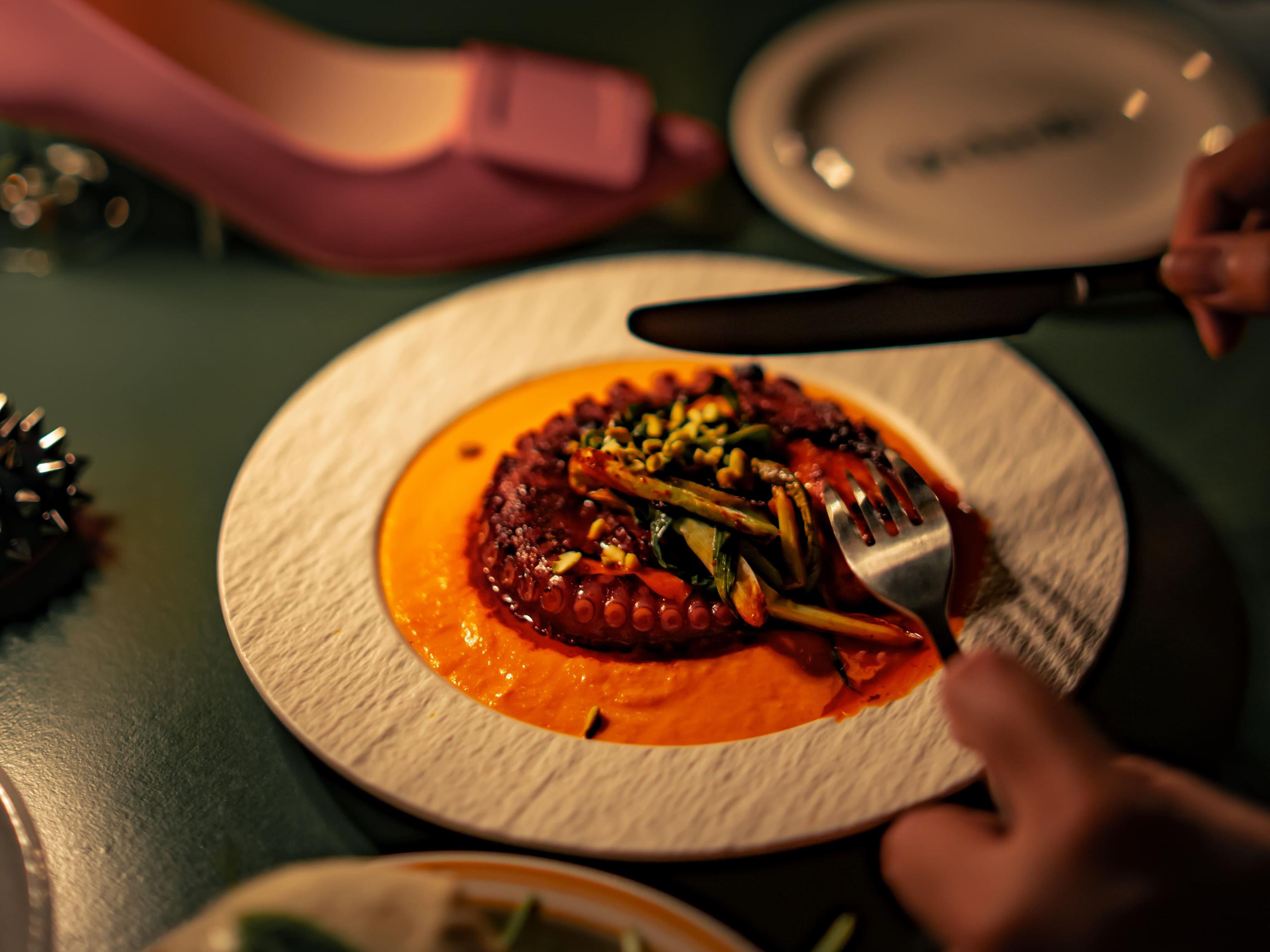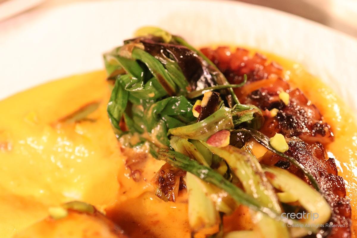 'The Stepmother's Beloved Polpo' ist ein Gericht aus Oktopus, Karottenpüree, gegrillten grünen Zwiebeln und Pistazien.