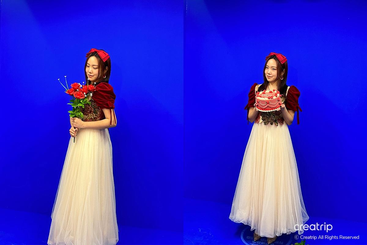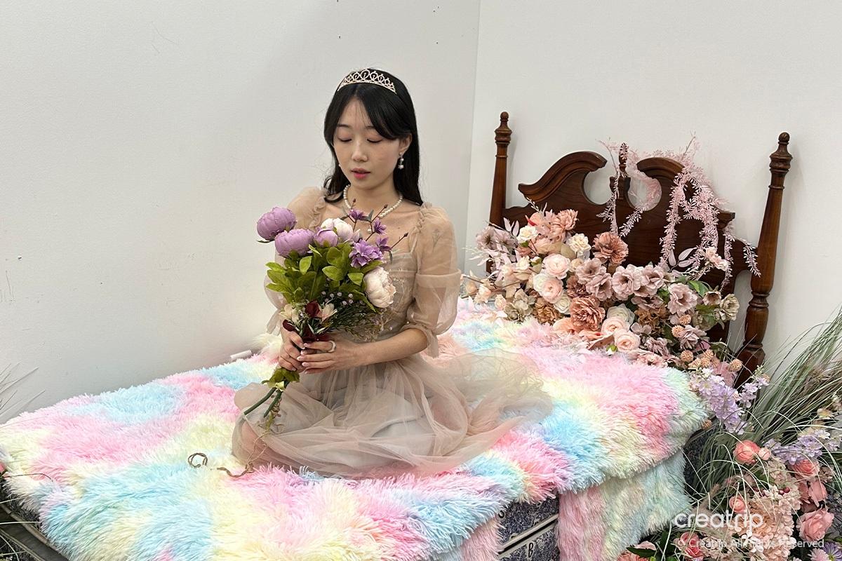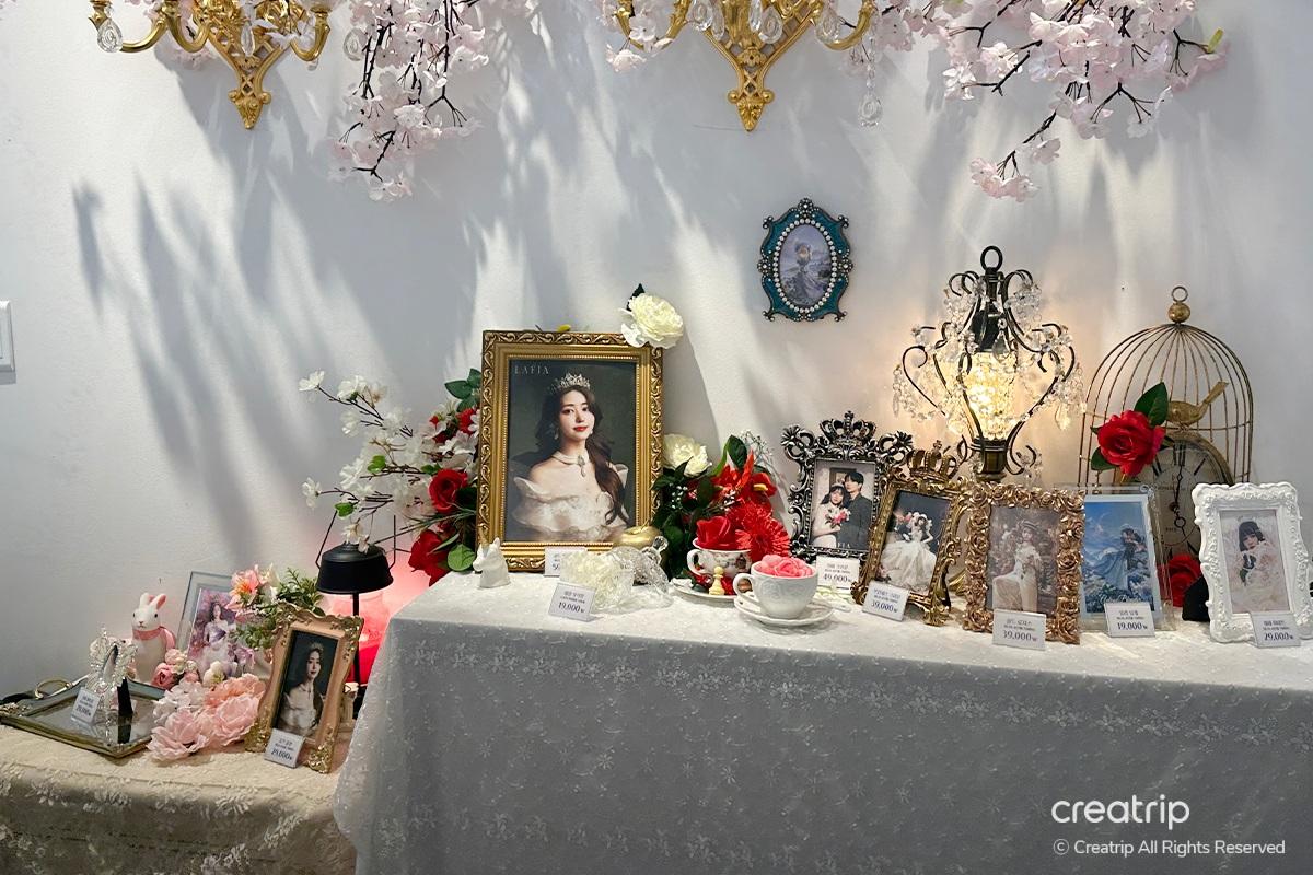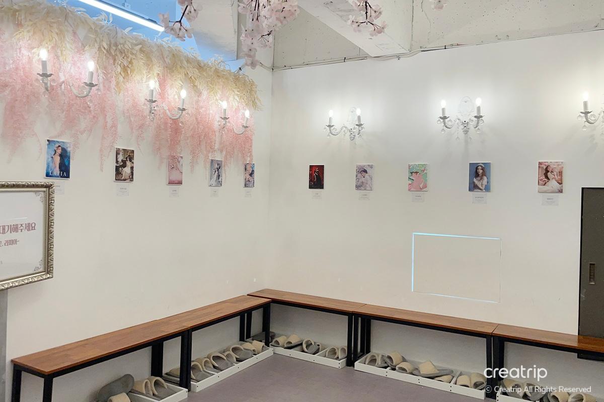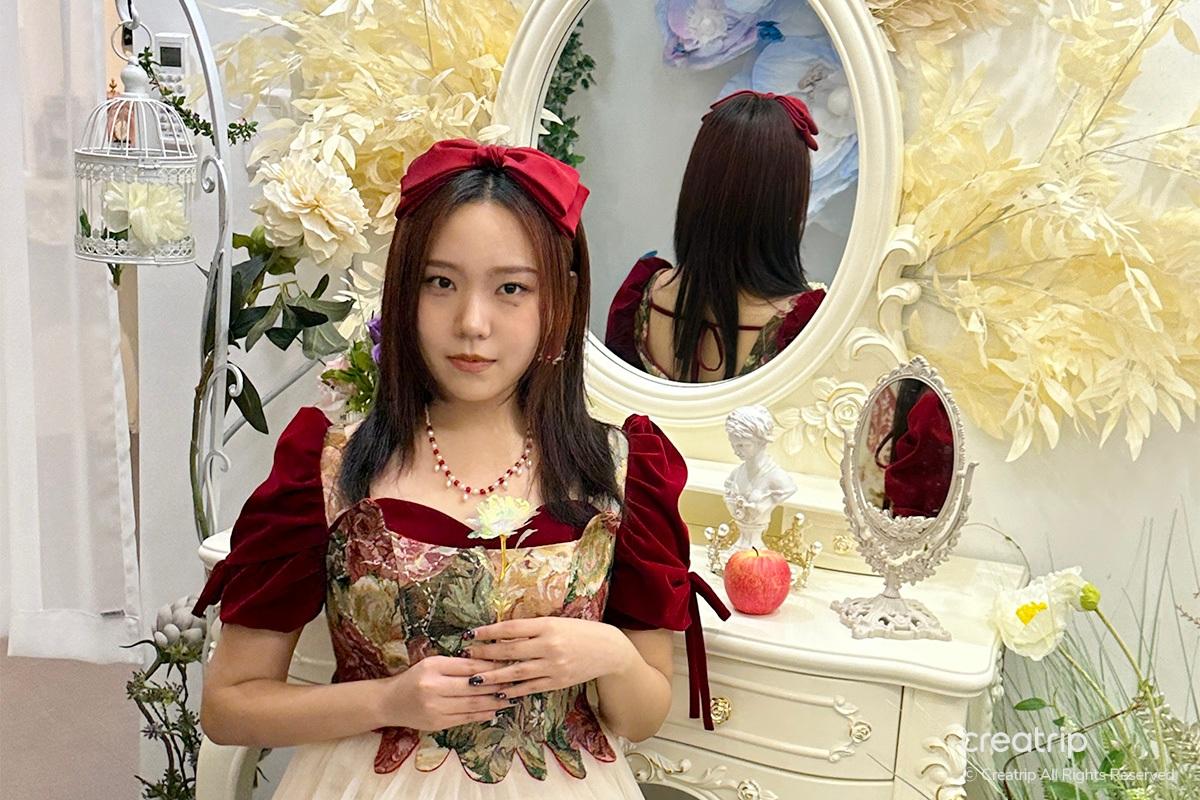 Nachdem ich das Produkt ausgewählt hatte, ging ich zur Selfie-Zone. Ein Spiegel voller Rosen, ein geheimnisvolles Bett inmitten von Blumengärten, ein Teich, aus dem Feen hervorzukommen scheinen, und Hintergründe, die zu den Kleidern passen, sind vorbereitet.
