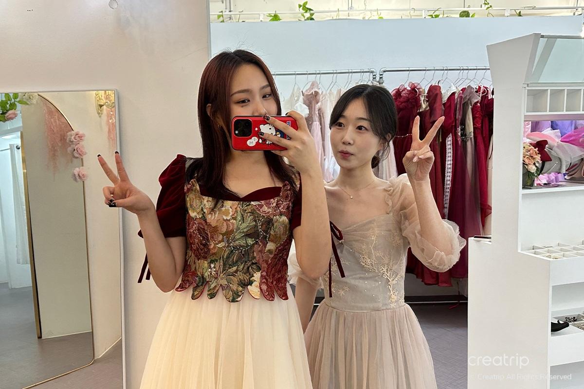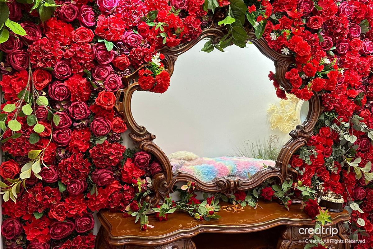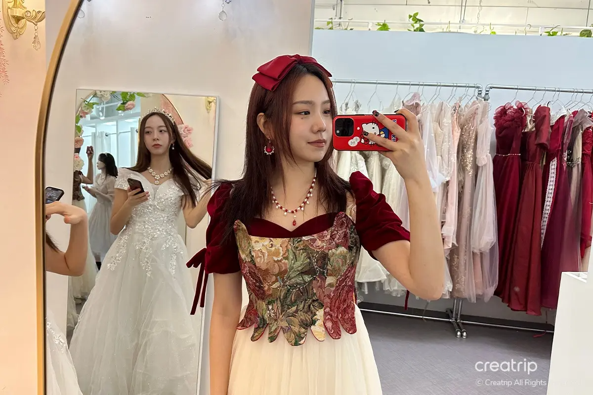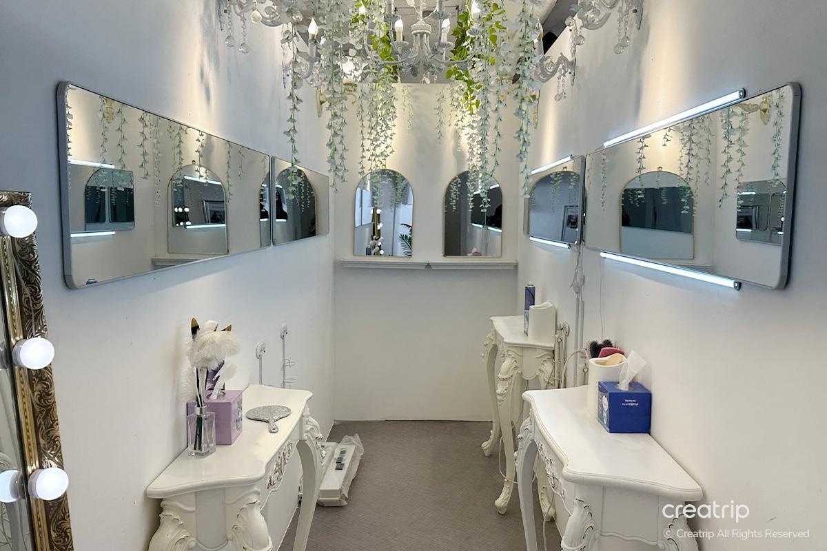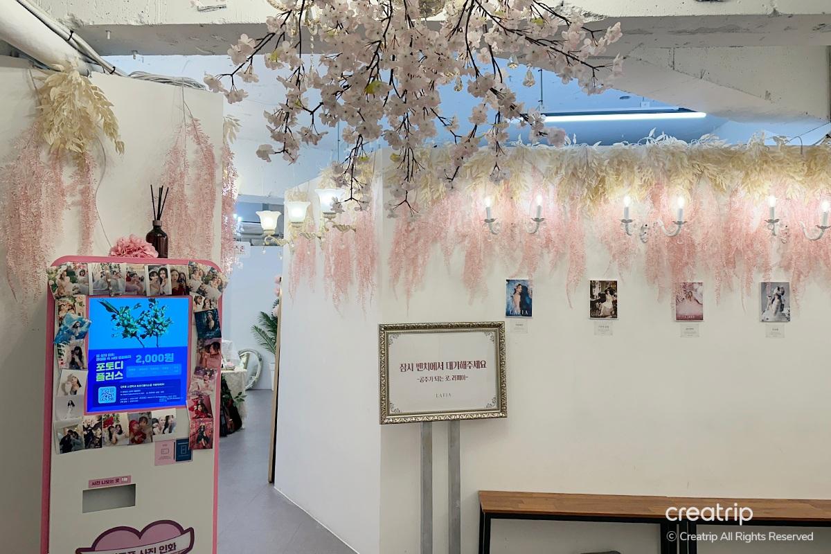 Nachdem ich das Produkt ausgewählt hatte, ging ich zur Selfie-Zone. Ein Spiegel voller Rosen, ein geheimnisvolles Bett inmitten von Blumengärten, ein Teich, aus dem Feen hervorzukommen scheinen, und Hintergründe, die zu den Kleidern passen, sind vorbereitet.