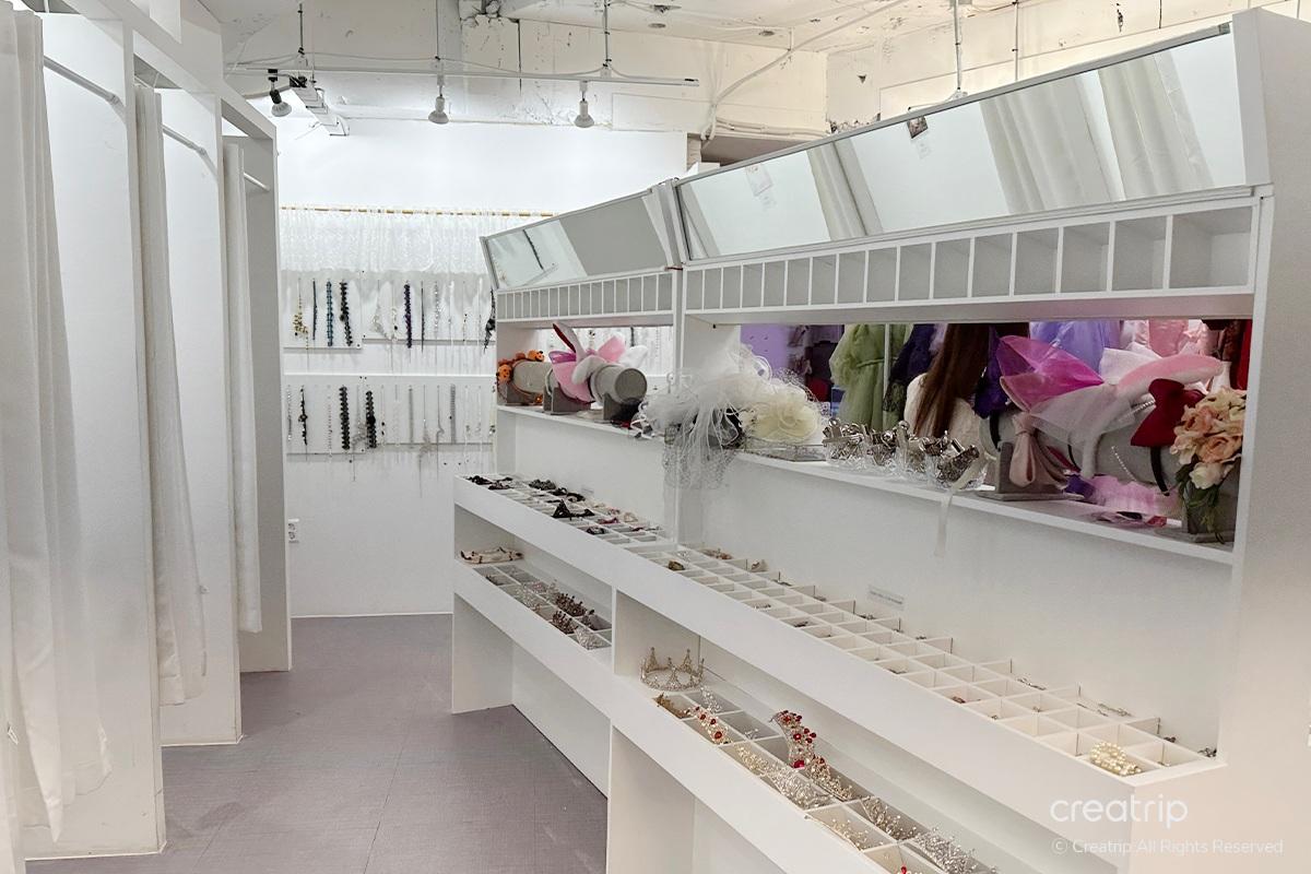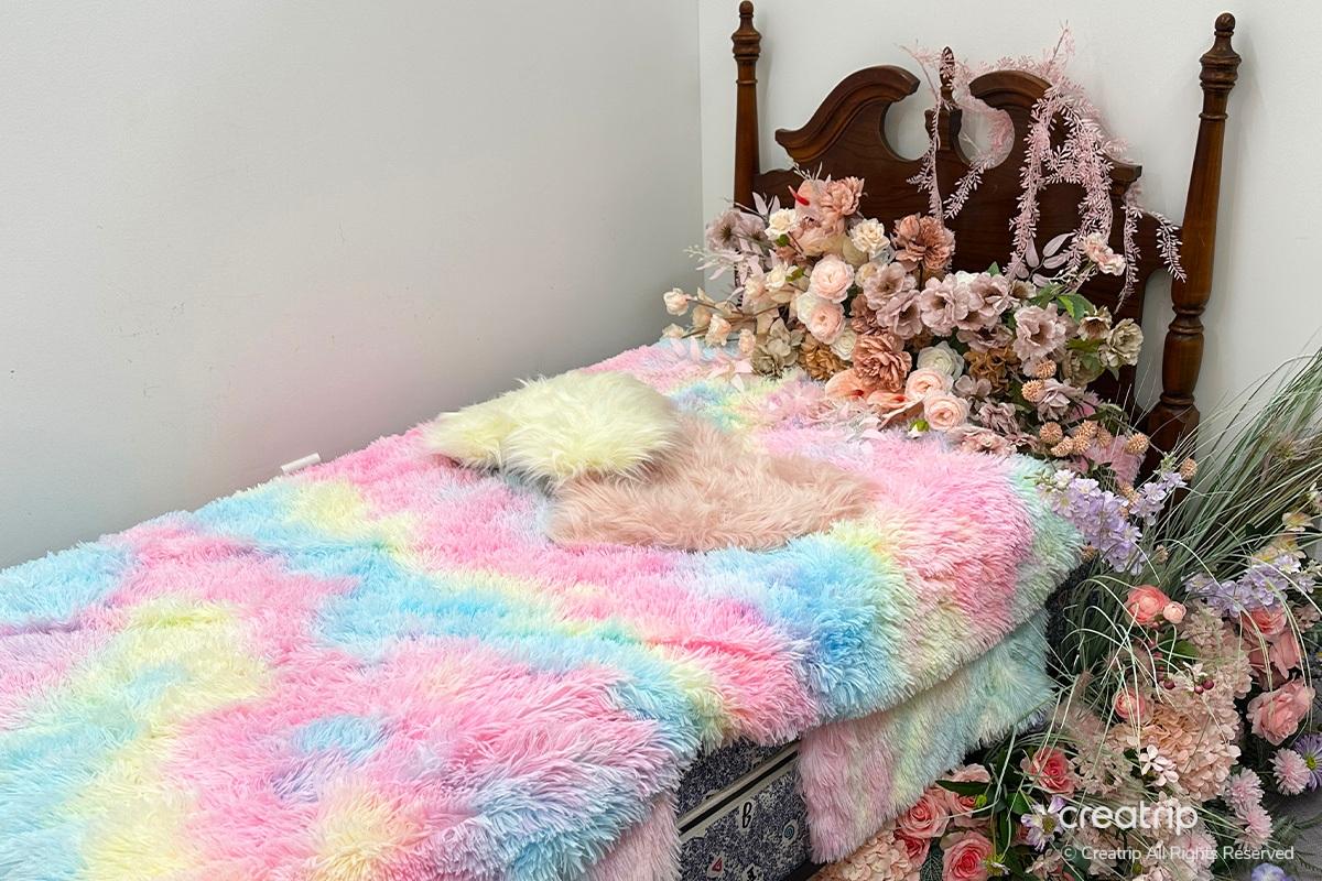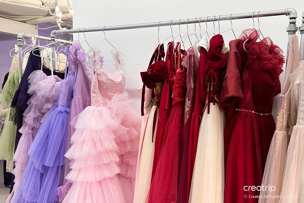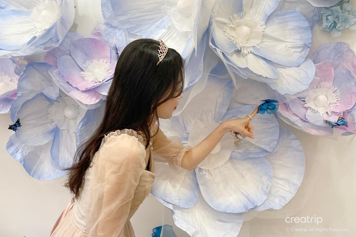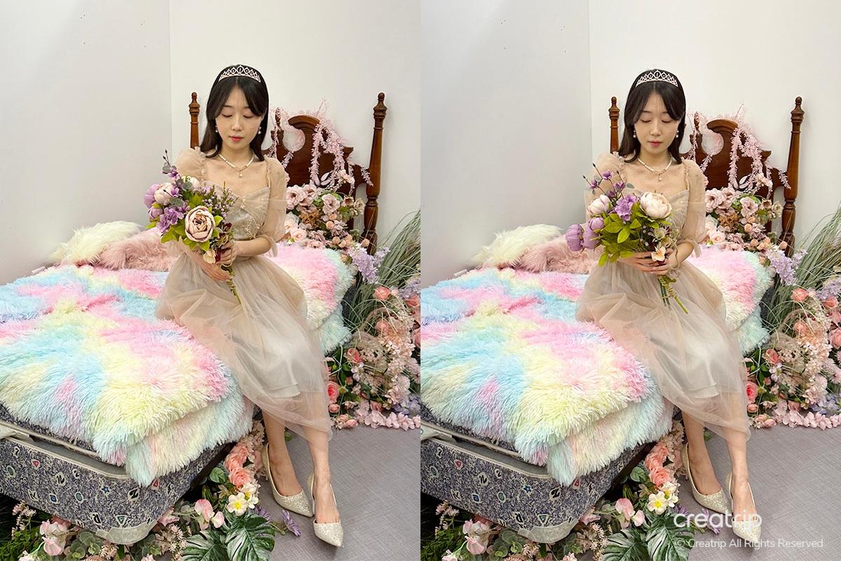 Nachdem ich das Produkt ausgewählt hatte, ging ich zur Selfie-Zone. Ein Spiegel voller Rosen, ein geheimnisvolles Bett inmitten von Blumengärten, ein Teich, aus dem Feen hervorzukommen scheinen, und Hintergründe, die zu den Kleidern passen, sind vorbereitet.