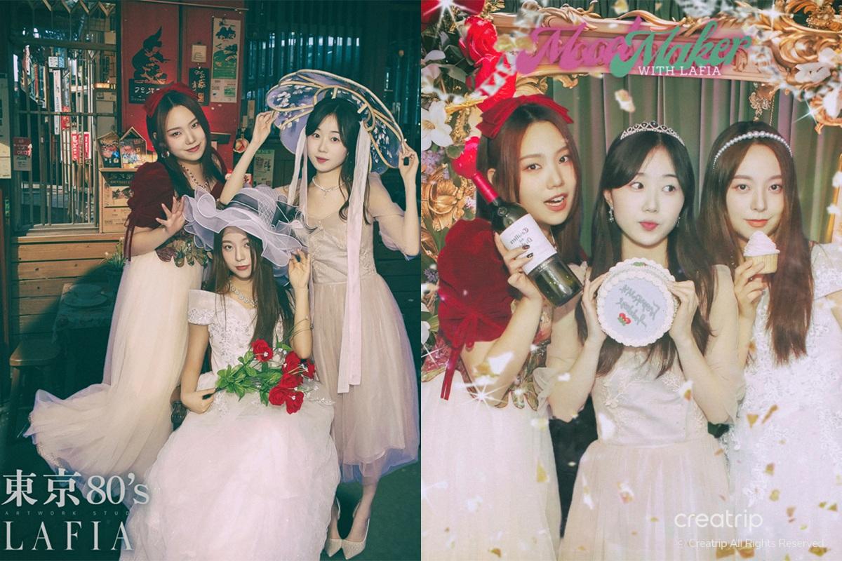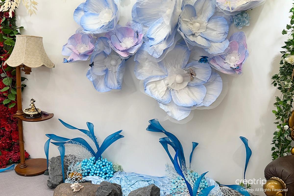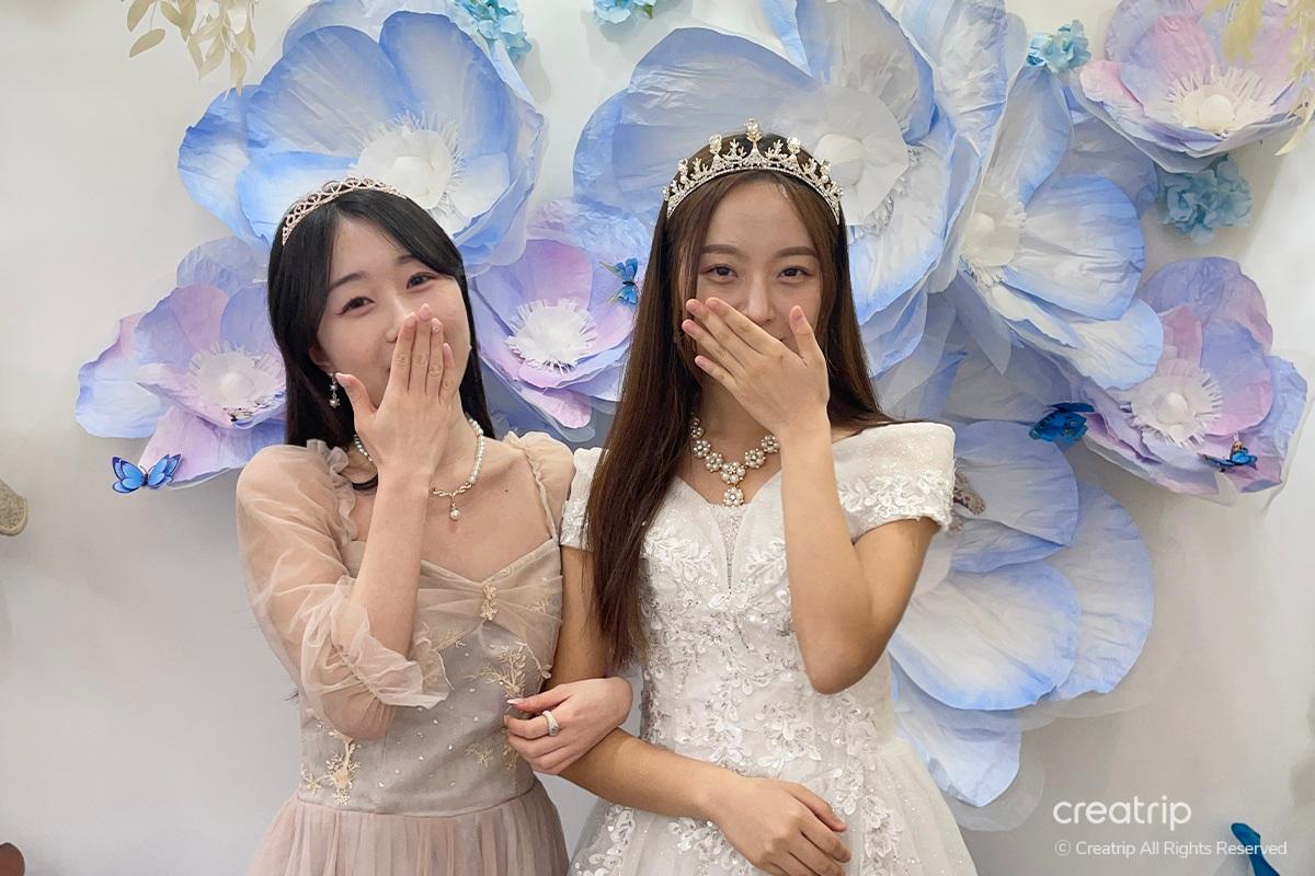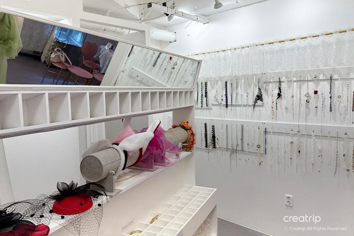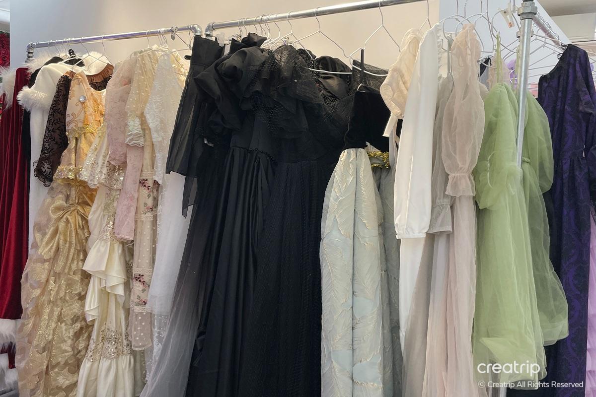 Nachdem ich das Produkt ausgewählt hatte, ging ich zur Selfie-Zone. Ein Spiegel voller Rosen, ein geheimnisvolles Bett inmitten von Blumengärten, ein Teich, aus dem Feen hervorzukommen scheinen, und Hintergründe, die zu den Kleidern passen, sind vorbereitet.