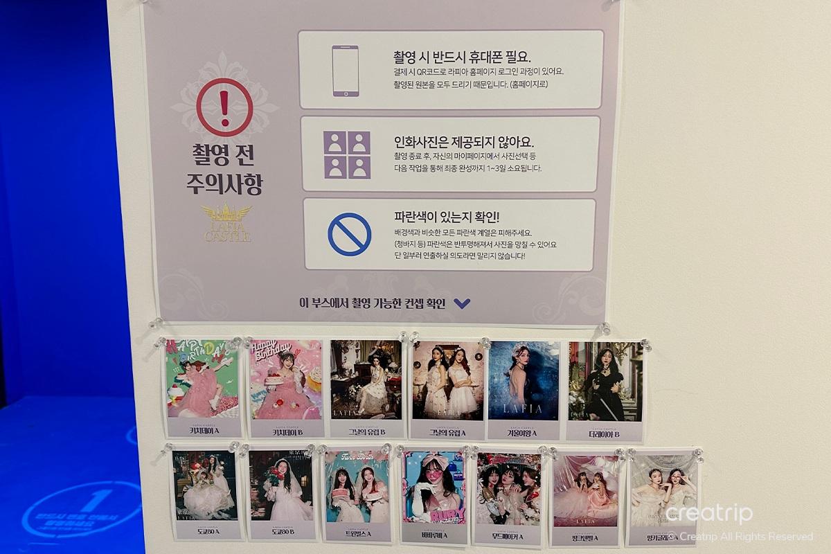- Bringen Sie für Ihre Bequemlichkeit eine Karte mit, da die meisten Dienstleistungen Kartenzahlung erfordern (Fotoautomat, Fotoausdruck, zusätzliche Kleiderwechsel, Dessertkäufe, Warenkäufe und Verlängerung der Nutzungszeit).