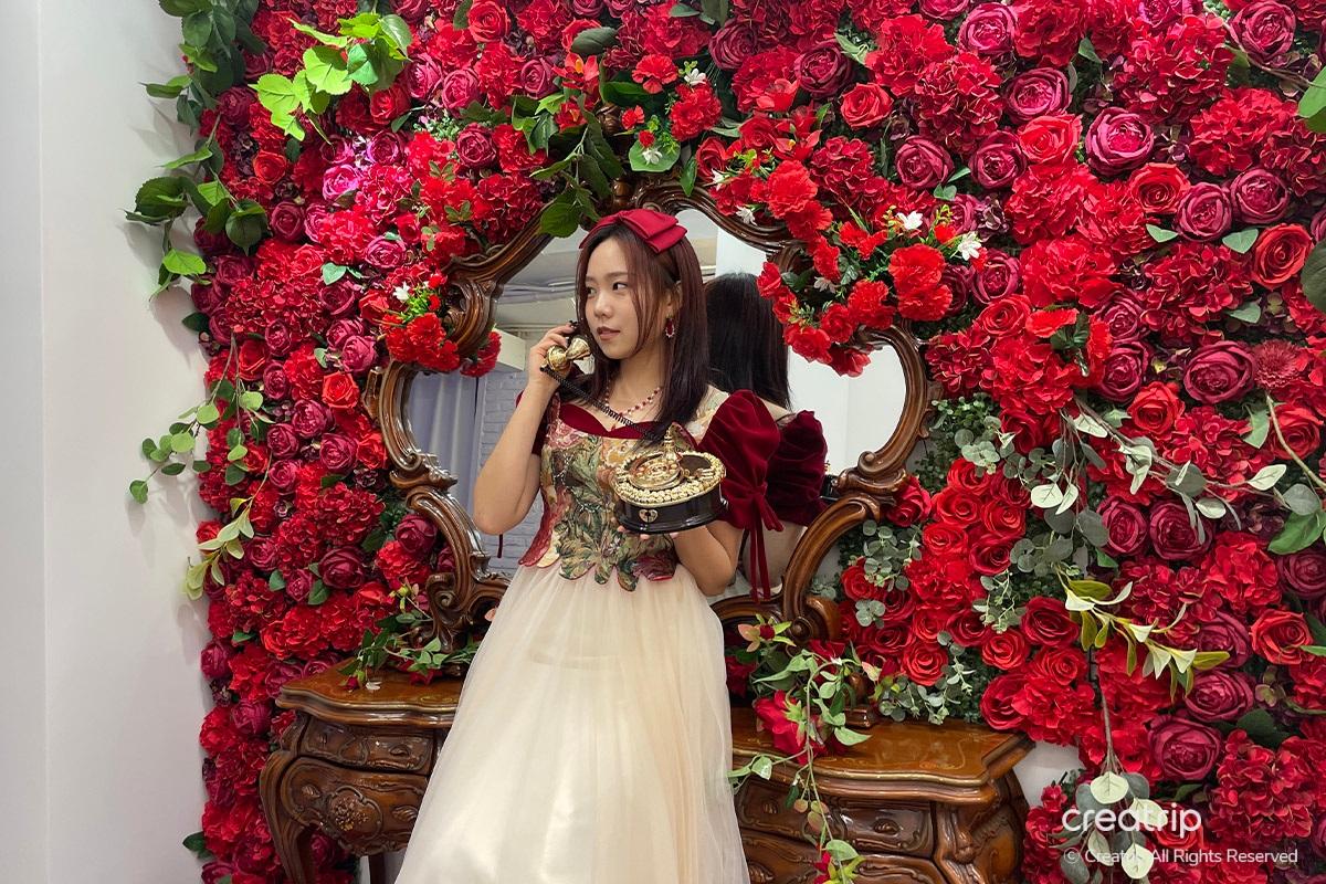 Schneewittchen-inspiriertes Kleid, der Redakteur, vor einem Spiegel voller Rosen, setzte das Shooting fort. Der Hintergrund ist so wunderschön, dass das Gesicht noch heller und prächtiger aussieht! In der Selfie-Zone wird empfohlen, eine Nahaufnahme zu machen, weil der Hintergrund im Foto erscheinen kann.