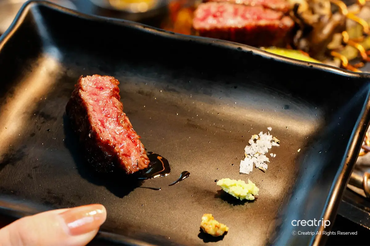 Es ist gut, eine kleine Menge Salz, Wasabi und körnigen Senfsauce auf einen Beiteller zu geben und dann vor dem Essen auf das Fleisch zu legen. Ein gut gebratenes Sirloin ist zart und saftig, sodass man sich in dem Moment wohlfühlt, in dem man es in den Mund nimmt.