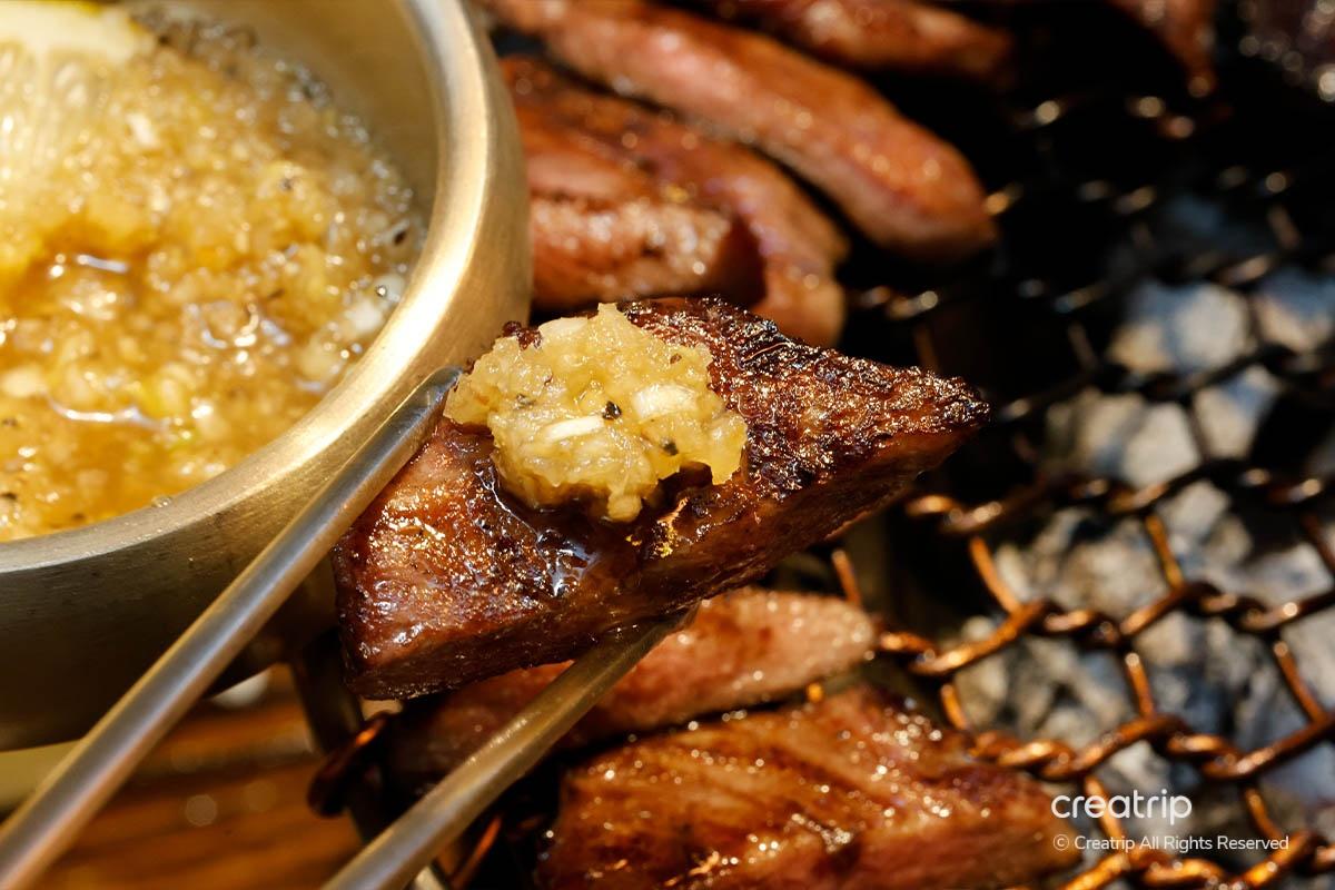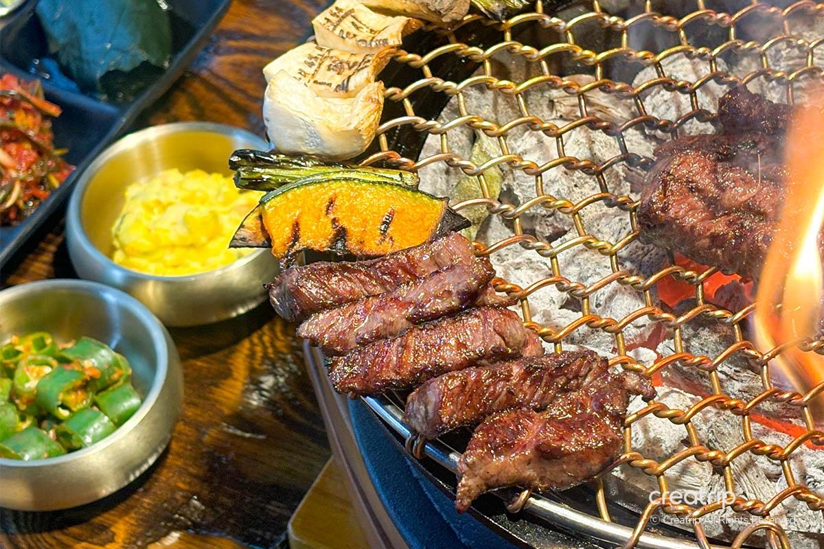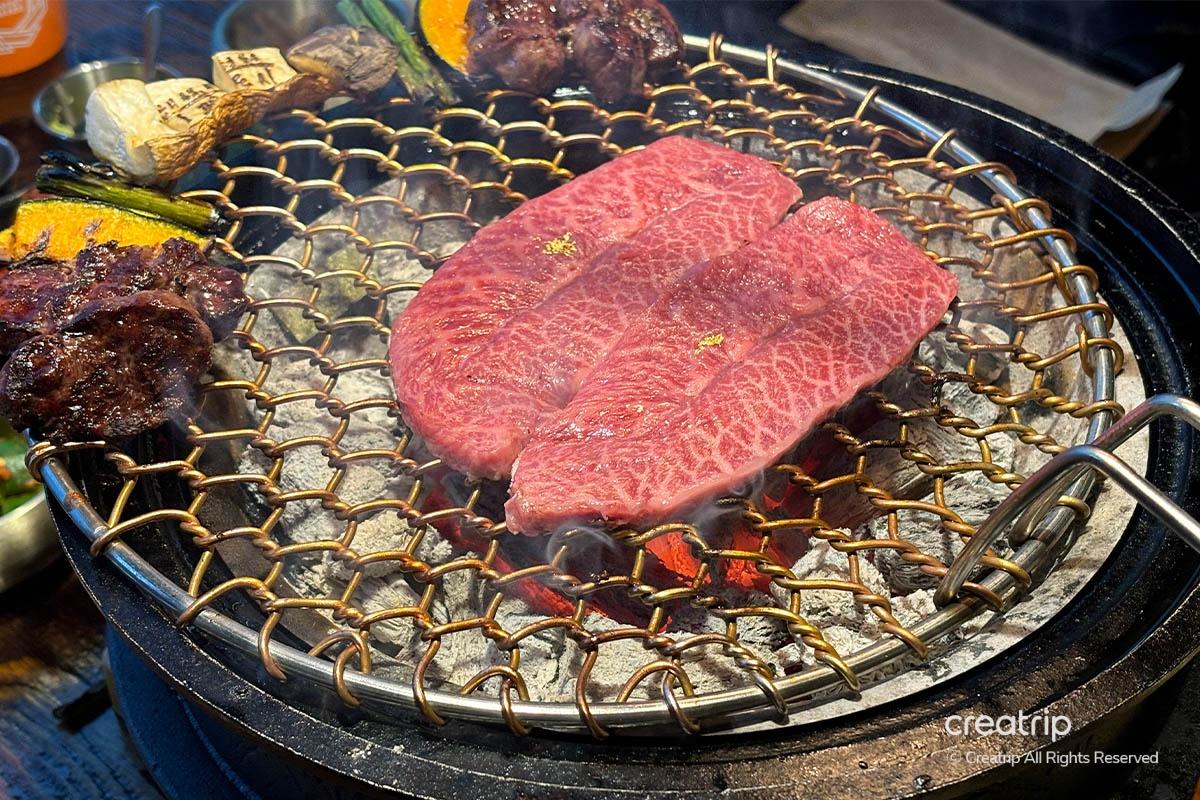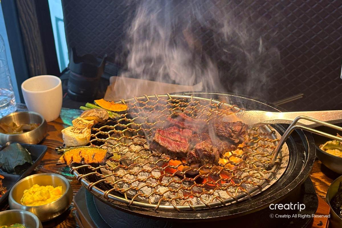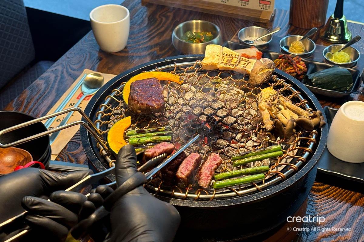 Ich beginne damit, das charakteristische Ilpyeon-Rinderrückensteak zu grillen und probiere es!Die Textur war glänzend, und die wunderschöne Marmorierung ließ mich den Geschmack wirklich erwarten.