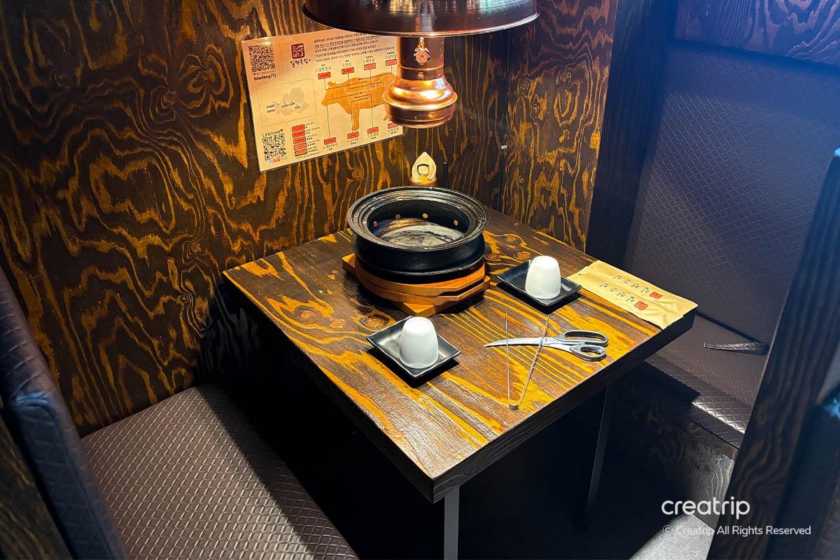 Das Innere des Geschäfts ist mit breiten Sofasitzen und Trennwänden an jedem Tisch ausgestattet, sodass Sie bequem und privat speisen können. Sie können eine angenehme Mahlzeit genießen, indem Sie das Fleisch langsam grillen.