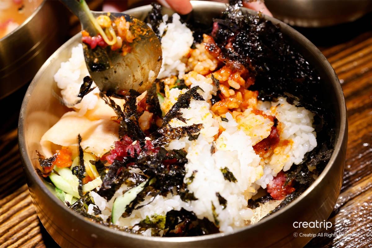 Nachdem ich das gegrillte Fleisch probiert habe, werde ich auch Yukhoe-Bibimbap essen.