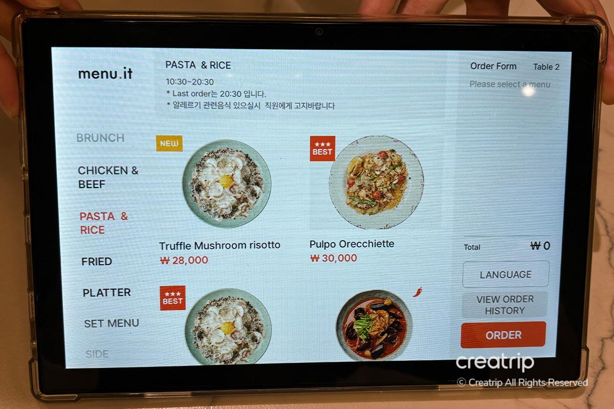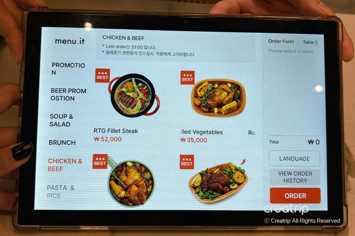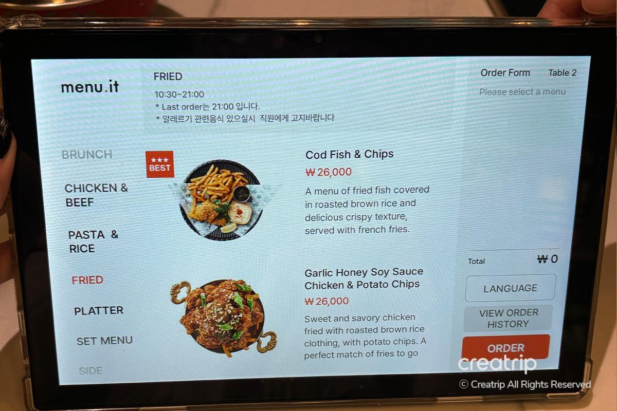 Mach dich bereit, dich hinzusetzen und deine Bestellung aufzugeben. Die Speisekarte unterstützt Koreanisch und Englisch, und du findest detaillierte Beschreibungen zu jedem Artikel.