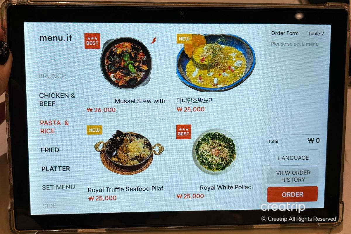 Es gab so viele verschiedene Menüoptionen, dass die Wahl schwer fiel. Der Redakteur entschied sich, 'Royal Baekmyeonran Oil Pasta', 'Royal Potato Sujebi Mussel Stew' und 'British Aristocratic Chicken & Roasted Vegetables' zu probieren.