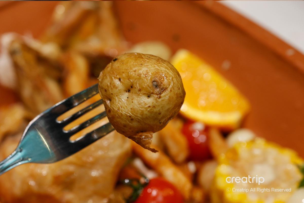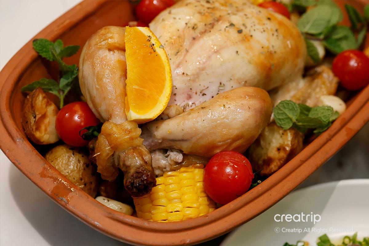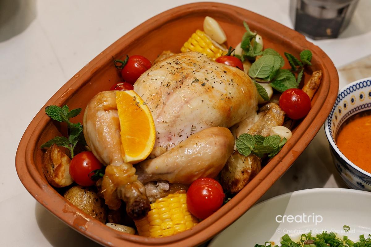 Der Redakteur wählte den britischen Brathähnchenstil, der in einem warmen deutschen Römertopf Tonbehälter serviert wurde, sodass Sie die Wärme bis zum letzten Stück genießen konnten.